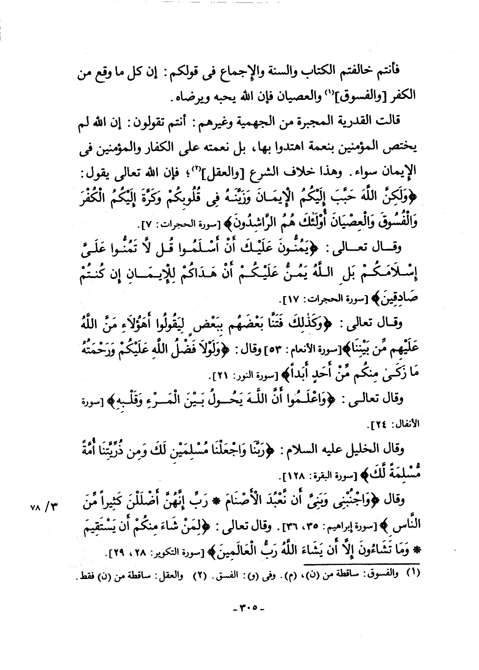 وَقَالَ: {وَاجْنُبْنِي وَبَنِيَّ أَنْ نَعْبُدَ الْأَصْنَامَ رَبِّ إِنَّهُنَّ أَضْلَلْنَ كَثِيرًا مِنَ النَّاسِ} [سُورَةُ إِبْرَاهِيمَ: 35 - 36] ، وَقَالَ تَعَالَى: {لِمَنْ شَاءَ مِنْكُمْ أَنْ يَسْتَقِيمَ وَمَا تَشَاءُونَ إِلَّا أَنْ يَشَاءَ اللَّهُ رَبُّ الْعَالَمِينَ} [سُورَةُ التَّكْوِيرِ: 28 - 29] .