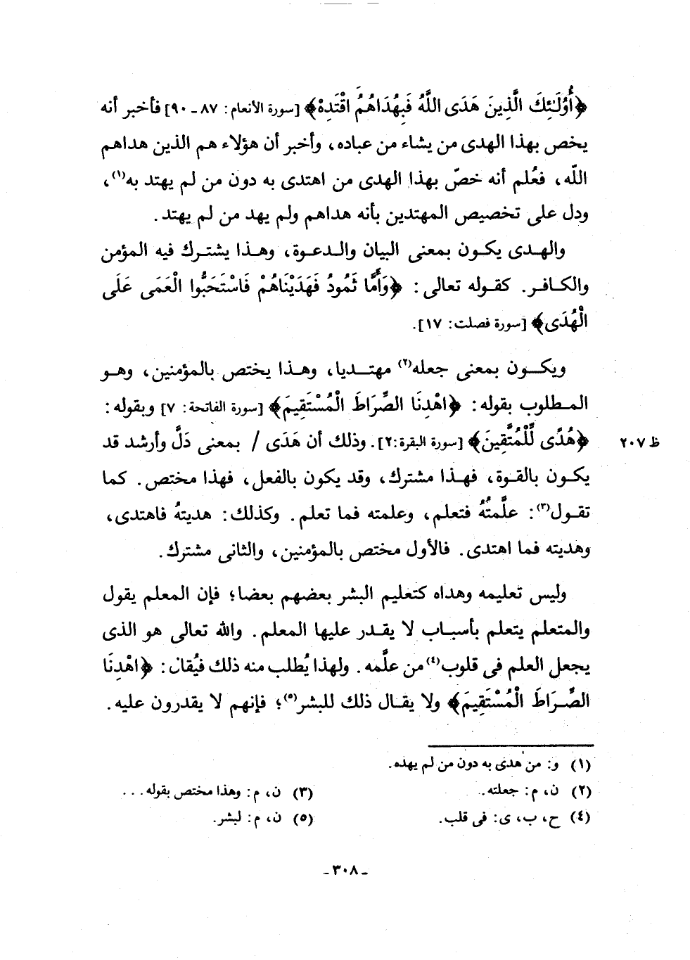 وَيَكُونُ بِمَعْنَى جَعَلَهُ (¬2) مُهْتَدِيًا، وَهَذَا يَخْتَصُّ بِالْمُؤْمِنِينَ، وَهُوَ الْمَطْلُوبُ بِقَوْلِهِ: {اهْدِنَا الصِّرَاطَ الْمُسْتَقِيمَ} [سُورَةُ الْفَاتِحَةِ: 7] ، وَبِقَوْلِهِ: {هُدًى لِلْمُتَّقِينَ} [سُورَةُ الْبَقَرَةِ: 2] . وَذَلِكَ أَنَّ هَدَى بِمَعْنَى دَلَّ وَأَرْشَدَ قَدْ يَكُونُ بِالْقُوَّةِ، فَهَذَا مُشْتَرَكٌ، وَقَدْ يَكُونُ بِالْفِعْلِ فَهَذَا مُخْتَصٌّ. كَمَا تَقُولُ (¬3) : عَلَّمْتُهُ فَتَعَلَّمَ، وَعَلَّمْتُهُ فَمَا تَعَلَّمَ. وَكَذَلِكَ: هَدَيْتُهُ فَاهْتَدَى، وَهَدَيْتُهُ فَمَا اهْتَدَى، فَالْأَوَّلُ مُخْتَصٌّ بِالْمُؤْمِنِينَ، وَالثَّانِي مُشْتَرَكٌ.