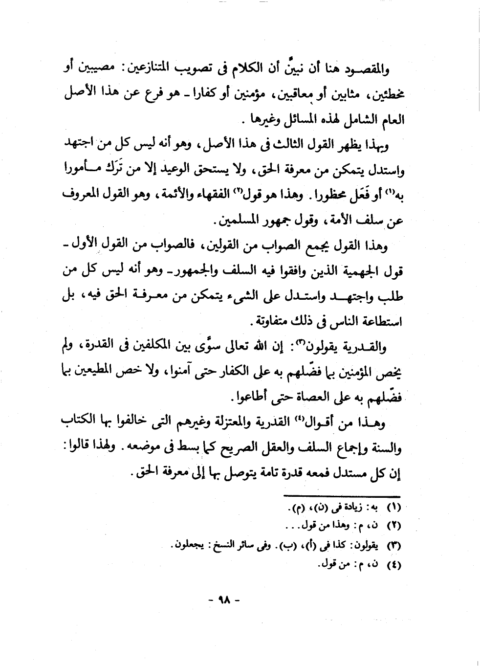 وَهَذَا الْقَوْلُ يَجْمَعُ الصَّوَابَ مِنَ الْقَوْلَيْنِ، فَالصَّوَابُ مِنَ الْقَوْلِ الْأَوَّلِ قَوْلُ الْجَهْمِيَّةِ الَّذِينَ وَافَقُوا فِيهِ السَّلَفَ وَالْجُمْهُورَ وَهُوَ أَنَّهُ لَيْسَ كُلُّ مَنْ طَلَبَ وَاجْتَهَدَ وَاسْتَدَلَّ عَلَى الشَّيْءِ يَتَمَكَّنُ مِنْ مَعْرِفَةِ الْحَقِّ فِيهِ، بَلِ اسْتِطَاعَةُ النَّاسِ فِي ذَلِكَ مُتَفَاوِتَةٌ.