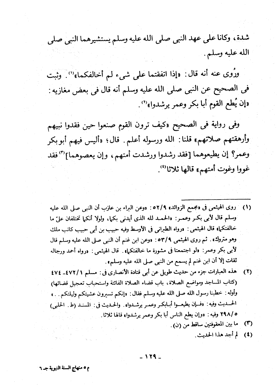 (¬2) هَذِهِ الْعِبَارَاتُ جُزْءٌ مِنْ حَدِيثٍ طَوِيلٍ عَنْ أَبِي قَتَادَةَ الْأَنْصَارِيِّ فِي: مُسْلِمٍ 1/472 - 474 كِتَابُ الْمَسَاجِدِ وَمَوَاضِعِ الصَّلَاةِ، بَابُ قَضَاءِ الصَّلَاةِ الْفَائِتَةِ وَاسْتِحْبَابِ تَعْجِيلِ قَضَائِهَا. وَأَوَّلُهُ: خَطَبَنَا رَسُولُ اللَّهِ صَلَّى اللَّهُ عَلَيْهِ وَسَلَّمَ فَقَالَ: إِنَّكُمْ تَسِيرُونَ عَشِيَّتَكُمْ وَلَيْلَتَكُمْ. الْحَدِيثَ وَفِيهِ: فَإِنْ يُطِيعُوا أَبَا بَكْرٍ وَعُمَرَ يَرْشُدُوا. الْحَدِيثُ فِي الْمُسْنَدِ ط. الْحَلَبِيِّ 5/298 وَفِيهِ: وَإِنْ يُطِعِ النَّاسُ أَبَا بَكْرٍ وَعُمَرَ يَرْشُدُوا. قَالَهَا ثَلَاثًا.