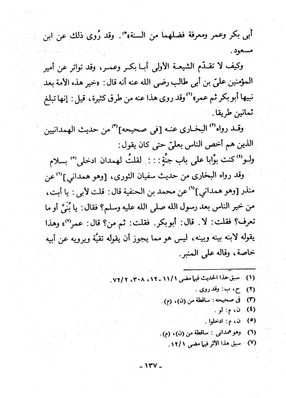 وَقَدْ رَوَاهُ الْبُخَارِيُّ مِنْ حَدِيثِ سُفْيَانَ الثَّوْرِيِّ، [وَهُوَ هَمْدَانِيٌّ] (¬7) عَنْ مُنْذِرٍ [وَهُوَ هَمْدَانِيٌّ] (¬8) عَنْ مُحَمَّدِ ابْنِ الْحَنَفِيَّةِ قَالَ: قُلْتُ لِأَبِي: يَا أَبَتِ، مَنْ خَيْرُ النَّاسِ بَعْدَ رَسُولِ اللَّهِ - صَلَّى اللَّهُ عَلَيْهِ وَسَلَّمَ -؟ فَقَالَ: يَا بُنَيَّ أَوَمَا تَعْرِفُ؟ فَقُلْتُ: لَا. قَالَ: أَبُو بَكْرٍ. فَقُلْتُ: ثُمَّ مَنْ؟ قَالَ: عُمَرُ. وَهَذَا يَقُولُهُ لِابْنِهِ بَيْنَهُ وَبَيْنَهُ، لَيْسَ هُوَ مِمَّا يَجُوزُ أَنْ يَقُولَهُ تُقْيَةً وَيَرْوِيَهُ عَنْ أَبِيهِ خَاصَّةً، وَقَالَهُ عَلَى الْمِنْبَرِ.
