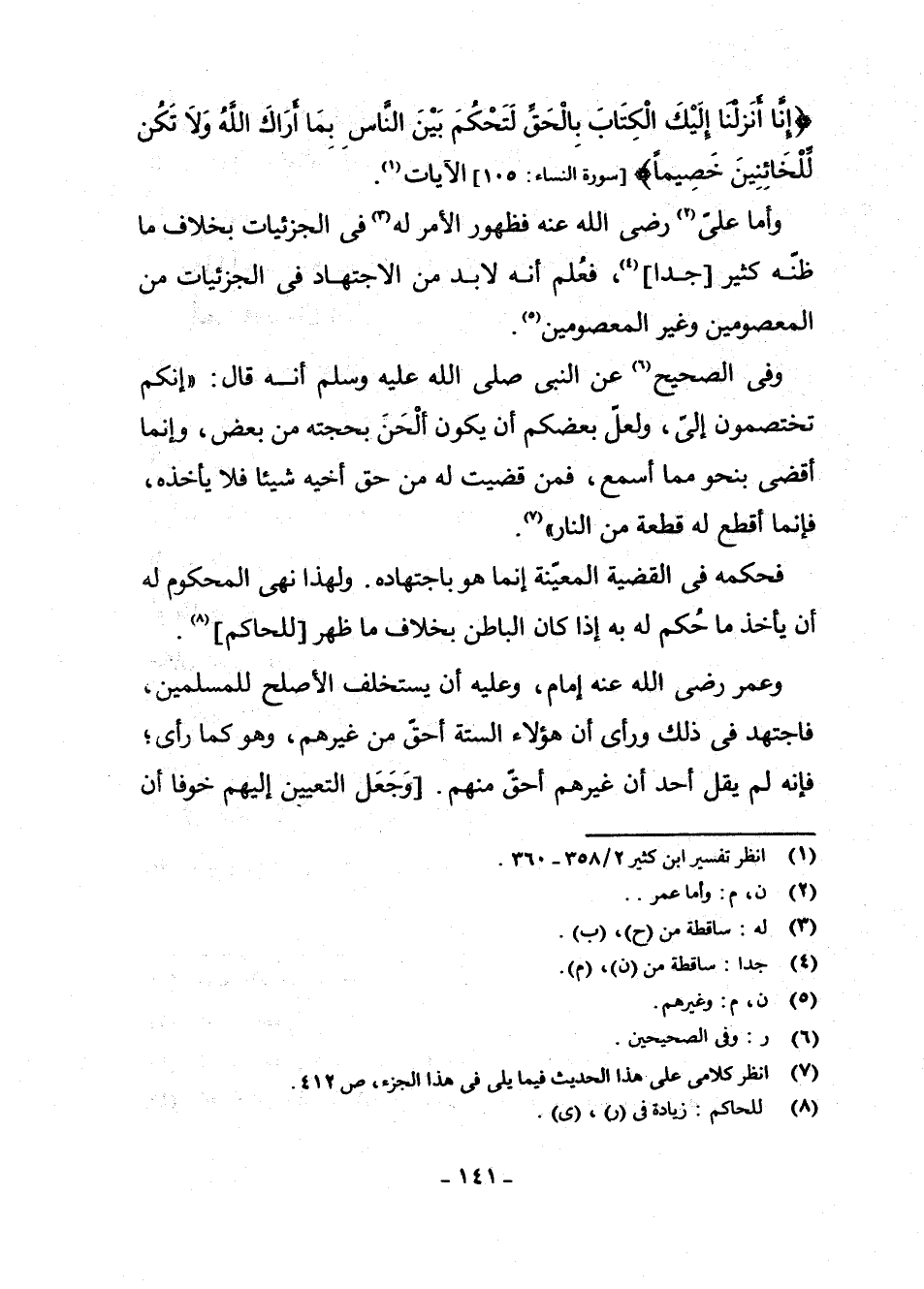 {إِنَّا أَنْزَلْنَا إِلَيْكَ الْكِتَابَ بِالْحَقِّ لِتَحْكُمَ بَيْنَ النَّاسِ بِمَا أَرَاكَ اللَّهُ وَلَا تَكُنْ لِلْخَائِنِينَ خَصِيمًا} [سُورَةُ النِّسَاءِ: 105] الْآيَاتِ (¬1) .