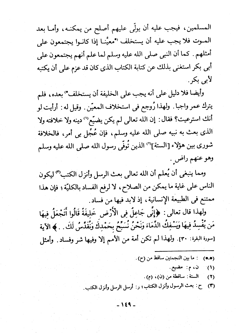 وَأَيْضًا فَلَا دَلِيلَ عَلَى أَنَّهُ يَجِبُ عَلَى الْخَلِيفَةِ أَنْ يَسْتَخْلِفَ *) (¬1) بَعْدَهُ، فَلَمْ يَتْرُكْ عُمَرُ وَاجِبًا. وَلِهَذَا رُوجِعَ فِي اسْتِخْلَافِ الْمُعَيَّنِ. وَقِيلَ لَهُ: أَرَأَيْتَ لَوْ أَنَّكَ اسْتَرْعَيْتَ؟ فَقَالَ: إِنَّ اللَّهَ تَعَالَى لَمْ يَكُنْ يُضَيِّعُ (¬2) دِينَهُ وَلَا خِلَافَتَهُ وَلَا الَّذِي بَعَثَ بِهِ نَبِيَّهُ صَلَّى اللَّهُ عَلَيْهِ وَسَلَّمَ، فَإِنْ عُجِّلَ بِي أَمْرٌ، فَالْخِلَافَةُ شُورَى بَيْنَ هَؤُلَاءِ [السِّتَّةِ] (¬3) الَّذِينَ تُوُفِّيَ رَسُولُ اللَّهِ - صَلَّى اللَّهُ عَلَيْهِ وَسَلَّمَ - وَهُوَ عَنْهُمْ رَاضٍ.