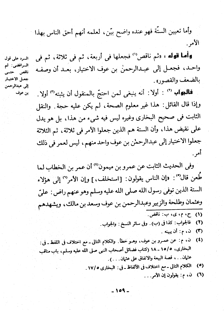 (¬4) ن، م: عَنْ عَمْرِو بْنِ عَوْفٍ، وَهُوَ خَطَأٌ، وَالْكَلَامُ التَّالِي مَعَ اخْتِلَافٍ فِي اللَّفْظِ، فِي الْبُخَارِيِّ: 5/15 - 18 (كِتَابُ فَضَائِلِ أَصْحَابِ النَّبِيِّ صَلَّى اللَّهُ عَلَيْهِ وَسَلَّمَ، بَابُ مَنَاقِبِ عُثْمَانَ، قِصَّةُ الْبَيْعَةِ وَالِاتِّفَاقِ عَلَى عُثْمَانَ)