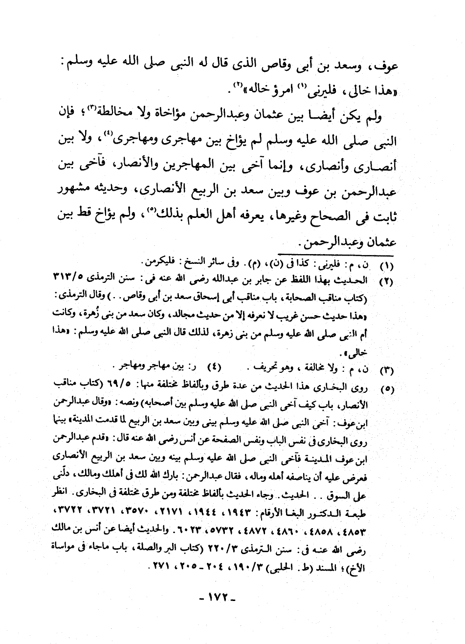 (¬5) رَوَى الْبُخَارِيُّ هَذَا الْحَدِيثَ مِنْ عِدَّةِ طُرُقٍ وَبِأَلْفَاظٍ مُخْتَلِفَةٍ مِنْهَا 5/69 كِتَابُ مَنَاقِبِ الْأَنْصَارِ، بَابُ كَيْفَ آخَى النَّبِيُّ صَلَّى اللَّهُ عَلَيْهِ وَسَلَّمَ بَيْنَ أَصْحَابِهِ، وَنَصُّهُ: وَقَالَ عَبْدُ الرَّحْمَنِ بْنُ عَوْفٍ: آخَى النَّبِيُّ صَلَّى اللَّهُ عَلَيْهِ وَسَلَّمَ بَيْنِي وَبَيْنَ سَعْدِ بْنِ الرَّبِيعِ لَمَّا قَدِمْتُ الْمَدِينَةَ. بَيْنَمَا رَوَى الْبُخَارِيُّ فِي نَفْسِ الْبَابِ وَنَفْسِ الصَّفْحَةِ عَنْ أَنَسٍ رَضِيَ اللَّهُ عَنْهُ قَالَ: قَدِمَ عَبْدُ الرَّحْمَنِ بْنُ عَوْفٍ الْمَدِينَةَ فَآخَى النَّبِيُّ صَلَّى اللَّهُ عَلَيْهِ وَسَلَّمَ بَيْنَهُ وَبَيْنَ سَعْدِ بْنِ الرَّبِيعِ الْأَنْصَارِيِّ فَعَرَضَ عَلَيْهِ أَنْ يُنَاصِفَهُ أَهْلَهُ وَمَالَهُ، فَقَالَ عَبْدُ الرَّحْمَنِ: بَارَكَ اللَّهُ لَكَ فِي أَهْلِكَ وَمَالِكَ، دُلَّنِي عَلَى السُّوقِ. الْحَدِيثَ. وَجَاءَ الْحَدِيثُ بِأَلْفَاظٍ مُخْتَلِفَةٍ وَمِنْ طُرُقٍ مُخْتَلِفَةٍ فِي الْبُخَارِيِّ، انْظُرْ طَبْعَةَ الدُّكْتُورِ أَلْبَغَا الْأَرْقَامُ: 1943، 1944، 2171، 3570، 3721، 3722، 4853، 4858، 4860، 4872، 5732، 6023، وَالْحَدِيثُ أَيْضًا عَنْ أَنَسِ بْنِ مَالِكٍ رَضِيَ اللَّهُ عَنْهُ فِي: سُنَنِ التِّرْمِذِيِّ 3/220 (كِتَابُ الْبِرِّ وَالصِّلَةِ، بَابُ مَا جَاءَ فِي مُوَاسَاةِ الْأَخِ) ، الْمُسْنَدِ ط. الْحَلَبِيِّ 3/190، 204 - 205، 271