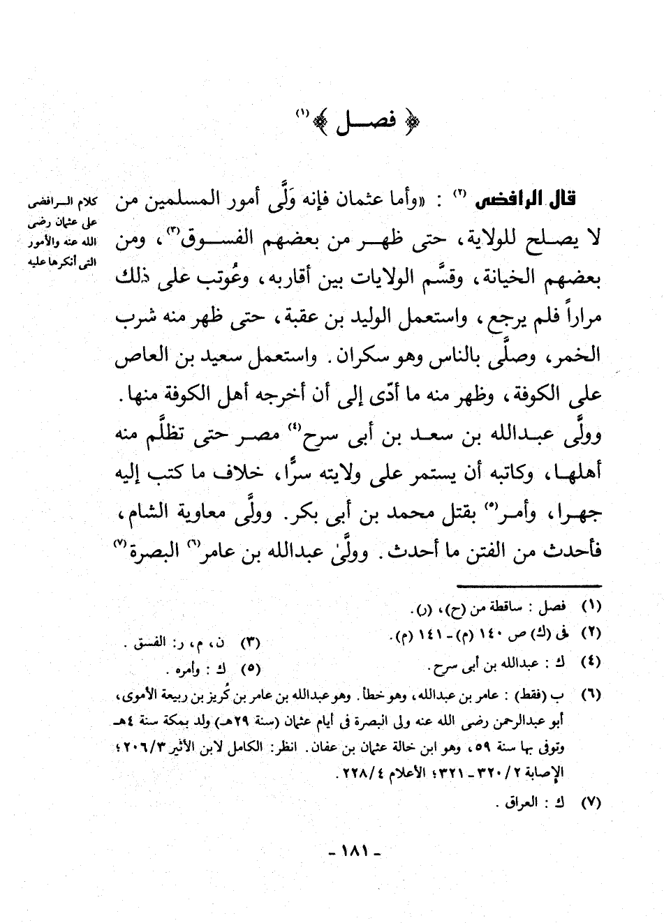 (¬6) ب فَقَطْ: عَامِرَ بْنَ عَبْدِ اللَّهِ، وَهُوَ خَطَأٌ، وَهُوَ عَبْدُ اللَّهِ بْنُ عَامِرِ بْنِ كُرَيْزِ بْنِ رَبِيعَةَ الْأُمَوِيُّ، أَبُو عَبْدِ الرَّحْمَنِ رَضِيَ اللَّهُ عَنْهُ، وَلِيَ الْبَصْرَةَ فِي أَيَّامِ عُثْمَانَ سَنَةَ 29 هـ وُلِدَ بِمَكَّةَ سَنَةَ 4 هـ وَتُوُفِّيَ بِهَا سَنَةَ 59، وَهُوَ ابْنُ خَالَةِ عُثْمَانَ بْنِ عَفَّانَ، انْظُرِ الْكَامِلَ لِابْنِ الْأَثِيرِ: 3/206، الْإِصَابَةَ 2/320 - 321، الْأَعْلَامَ 4/228