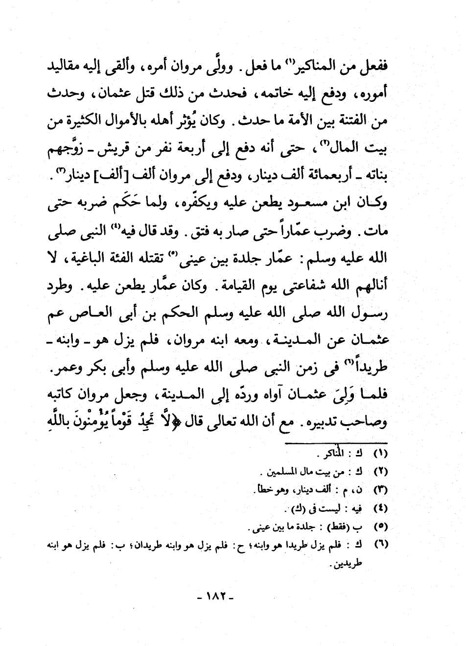 فَفَعَلَ مِنَ الْمَنَاكِيرِ (¬1) مَا فَعَلَ. وَوَلَّى مَرْوَانَ أَمْرَهُ، وَأَلْقَى إِلَيْهِ مَقَالِيدَ أُمُورِهِ، وَدَفَعَ إِلَيْهِ خَاتَمَهُ، فَحَدَثَ مِنْ ذَلِكَ قَتْلُ عُثْمَانَ، وَحَدَثَ مِنَ الْفِتْنَةِ بَيْنَ الْأُمَّةِ مَا حَدَثَ. وَكَانَ يُؤْثِرُ أَهْلَهُ بِالْأَمْوَالِ الْكَثِيرَةِ مِنْ بَيْتِ الْمَالِ (¬2) ، حَتَّى أَنَّهُ دَفَعَ إِلَى أَرْبَعَةِ نَفَرٍ مِنْ قُرَيْشٍ - زَوَّجَهُمْ بَنَاتِهِ - أَرْبَعَمِائَةِ أَلْفِ دِينَارٍ، وَدَفَعَ إِلَى مَرْوَانَ أَلْفَ [أَلْفَ] دِينَارٍ (¬3) . وَكَانَ ابْنُ مَسْعُودٍ يَطْعَنُ عَلَيْهِ وَيُكَفِّرُهُ، وَلَمَّا حَكَمَ ضَرَبَهُ حَتَّى مَاتَ. وَضَرَبَ عَمَّارًا حَتَّى صَارَ بِهِ فَتْقٌ. وَقَدْ قَالَ فِيهِ (¬4) النَّبِيُّ - صَلَّى اللَّهُ عَلَيْهِ وَسَلَّمَ -: «عَمَّارٌ جِلْدَةٌ بَيْنَ عَيْنَيَّ (¬5) تَقْتُلُهُ الْفِئَةُ الْبَاغِيَةُ، لَا أَنَالَهُمُ اللَّهُ شَفَاعَتِي يَوْمَ الْقِيَامَةِ» . وَكَانَ عَمَّارٌ يَطْعَنُ عَلَيْهِ. وَطَرَدَ رَسُولُ اللَّهِ - صَلَّى اللَّهُ عَلَيْهِ وَسَلَّمَ - الْحَكَمَ بْنَ أَبِي الْعَاصِ عَمَّ عُثْمَانَ عَنِ الْمَدِينَةِ، وَمَعَهُ ابْنُهُ مَرْوَانُ، فَلَمْ يَزَلْ هُوَ - وَابْنُهُ - طَرِيدًا (¬6) فِي زَمَنِ النَّبِيِّ - صَلَّى اللَّهُ عَلَيْهِ وَسَلَّمَ - وَأَبِي بَكْرٍ وَعُمَرَ. فَلَمَّا وَلِيَ عُثْمَانُ آوَاهُ وَرَدَّهُ إِلَى الْمَدِينَةِ، وَجَعَلَ مَرْوَانَ كَاتِبَهُ وَصَاحِبَ تَدْبِيرِهِ. مَعَ أَنَّ اللَّهَ تَعَالَى قَالَ: {لَا تَجِدُ قَوْمًا يُؤْمِنُونَ بِاللَّهِ وَالْيَوْمِ الْآخِرِ يُوَادُّونَ مَنْ حَادَّ اللَّهَ وَرَسُولَهُ وَلَوْ كَانُوا آبَاءَهُمْ أَوْ أَبْنَاءَهُمْ} الْآيَةَ [سُورَةُ الْمُجَادَلَةِ: 22] .