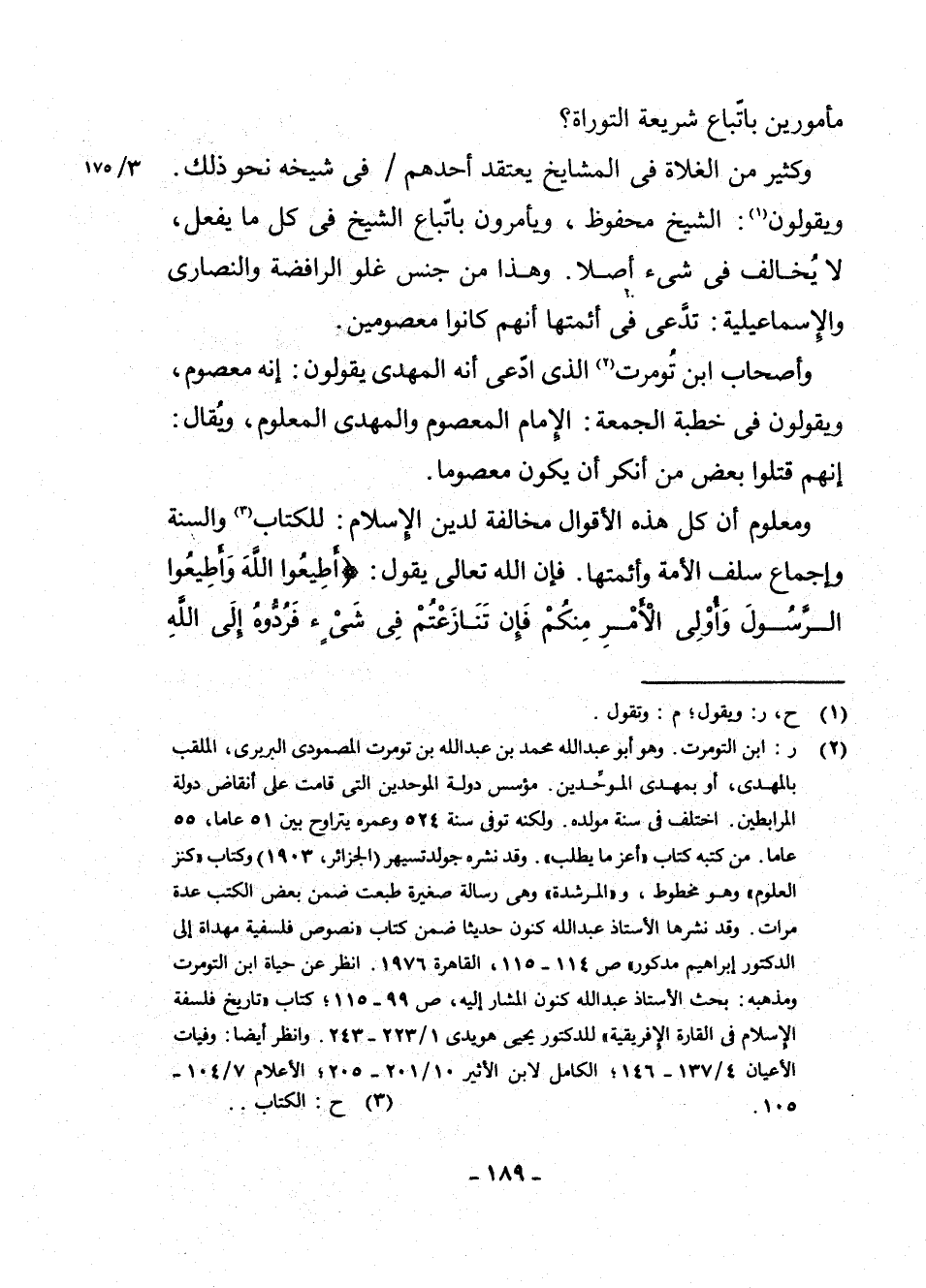 (¬2) ر: ابْنِ التُّومَرْتِ، وَهُوَ أَبُو عَبْدِ اللَّهِ مُحَمَّدُ بْنُ عَبْدِ اللَّهِ بْنِ تُومَرْتَ الْمَصْمُودِيُّ الْبَرْبَرِيُّ، الْمُلَقَّبُ بِالْمَهْدِيِّ، أَوْ بِمَهْدَيِّ الْمُوَحِّدِينَ: مُؤَسِّسُ دَوْلَةِ الْمُوَحِّدِينَ الَّتِي قَامَتْ عَلَى أَنْقَاضِ دَوْلَةِ الْمُرَابِطِينَ اخْتُلِفَ فِي سَنَةِ مَوْلِدِهِ، وَلَكِنَّهُ تُوُفِّيَ سَنَةَ 524 وَعُمْرُهُ يَتَرَاوَحُ بَيْنَ 51 عَامًا، 55 عَامًا مِنْ كُتُبِهِ كِتَابُ " أَعَزُّ مَا يُطْلَبُ "، وَقَدْ نَشَرَهُ جُولْد تَسْيِهر، الْجَزَائِرُ 1903، وَكِتَابُ كَنْزُ الْعُلُومِ، وَهُوَ مَخْطُوطٌ، وَالْمُرْشِدَةُ وَهِيَ رِسَالَةٌ صَغِيرَةٌ طُبِعَتْ ضِمْنَ بَعْضِ الْكُتُبِ عِدَّةَ مَرَّاتٍ وَقَدْ نَشَرَهَا الْأُسْتَاذُ عَبْدُ اللَّهِ كَنُون حَدِيثًا ضِمْنَ كِتَابِ نُصُوصٍ فَلْسَفِيَّةٍ مُهْدَاةٍ إِلَى الدُّكْتُورِ إِبْرَاهِيم مَدْكُور، ص 114 - 115، الْقَاهِرَةُ 1976، انْظُرْ عَنْ حَيَاةِ ابْنِ التَّوْمَرْتِ وَمَذْهَبِهِ، بَحْثَ الْأُسْتَاذِ عَبْدِ اللَّهِ كَنُون الْمُشَارَ إِلَيْهِ، ص 99 - 115 كِتَابَ تَارِيخِ فَلْسَفَةِ الْإِسْلَامِ فِي الْقَارَّةِ الْأَفْرِيقِيَّةِ لِلدُّكْتُورِ يَحْيَى هُوَيْدِي 1/223 - 243 وَانْظُرْ أَيْضًا: وَفَيَاتِ الْأَعْيَانِ 4/137 - 146 الْكَامِلَ لِابْنِ الْأَثِيرِ 10 201 - 205، الْأَعْلَامَ 7/104 - 105