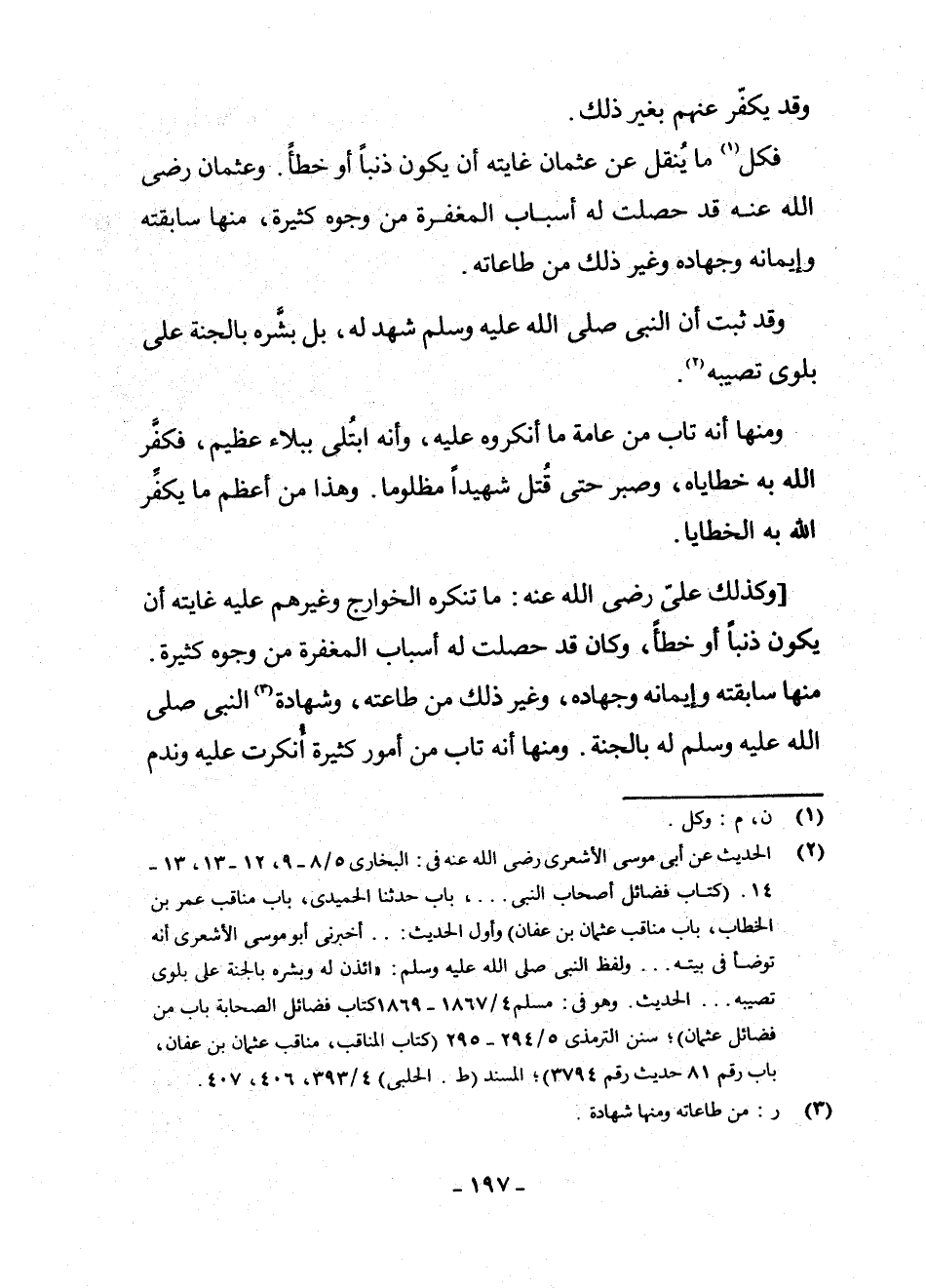 فَكُلُّ (¬1) مَا يُنْقَلُ عَنْ عُثْمَانَ غَايَتُهُ أَنْ يَكُونَ ذَنْبًا أَوْ خَطَأً. وَعُثْمَانُ - رَضِيَ اللَّهُ عَنْهُ - قَدْ حَصَلَتْ لَهُ أَسْبَابُ الْمَغْفِرَةِ مِنْ وُجُوهٍ كَثِيرَةٍ، مِنْهَا سَابِقَتُهُ وَإِيمَانُهُ وَجِهَادُهُ وَغَيْرُ ذَلِكَ مِنْ طَاعَاتِهِ.