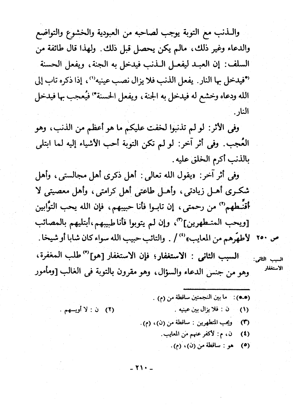 وَفِي الْأَثَرِ: «لَوْ لَمْ تُذْنِبُوا لَخِفْتُ عَلَيْكُمْ مَا هُوَ أَعْظَمُ مِنَ الذَّنْبِ، وَهُوَ الْعُجْبُ» . وَفِي أَثَرٍ آخَرَ: «لَوْ لَمْ تَكُنِ التَّوْبَةُ أَحَبَّ الْأَشْيَاءِ إِلَيْهِ لَمَا ابْتَلَى بِالذَّنْبِ أَكْرَمَ الْخَلْقِ عَلَيْهِ» .