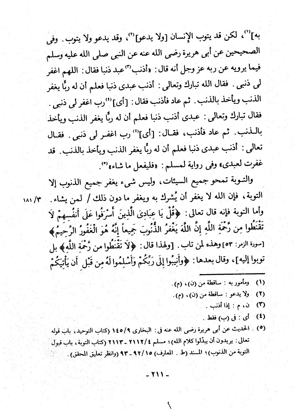 (¬6) الْحَدِيثُ عَنْ أَبِي هُرَيْرَةَ رَضِيَ اللَّهُ عَنْهُ فِي الْبُخَارِيِّ 9/145 (كِتَابُ التَّوْحِيدِ بَابُ قَوْلِهِ تَعَالَى: يُرِيدُونَ أَنْ يُبَدِّلُوا كَلَامَ اللَّهِ) ؛ مُسْلِمٍ 4/2112 - 2113 (كِتَابُ التَّوْبَةِ، بَابُ قَبُولِ التَّوْبَةِ مِنَ الذُّنُوبِ) ؛ الْمُسْنَدِ ط. الْمَعَارِفِ 15 92 - 93 وَانْظُرْ تَعْلِيقَ الْمُحَقِّقِ.