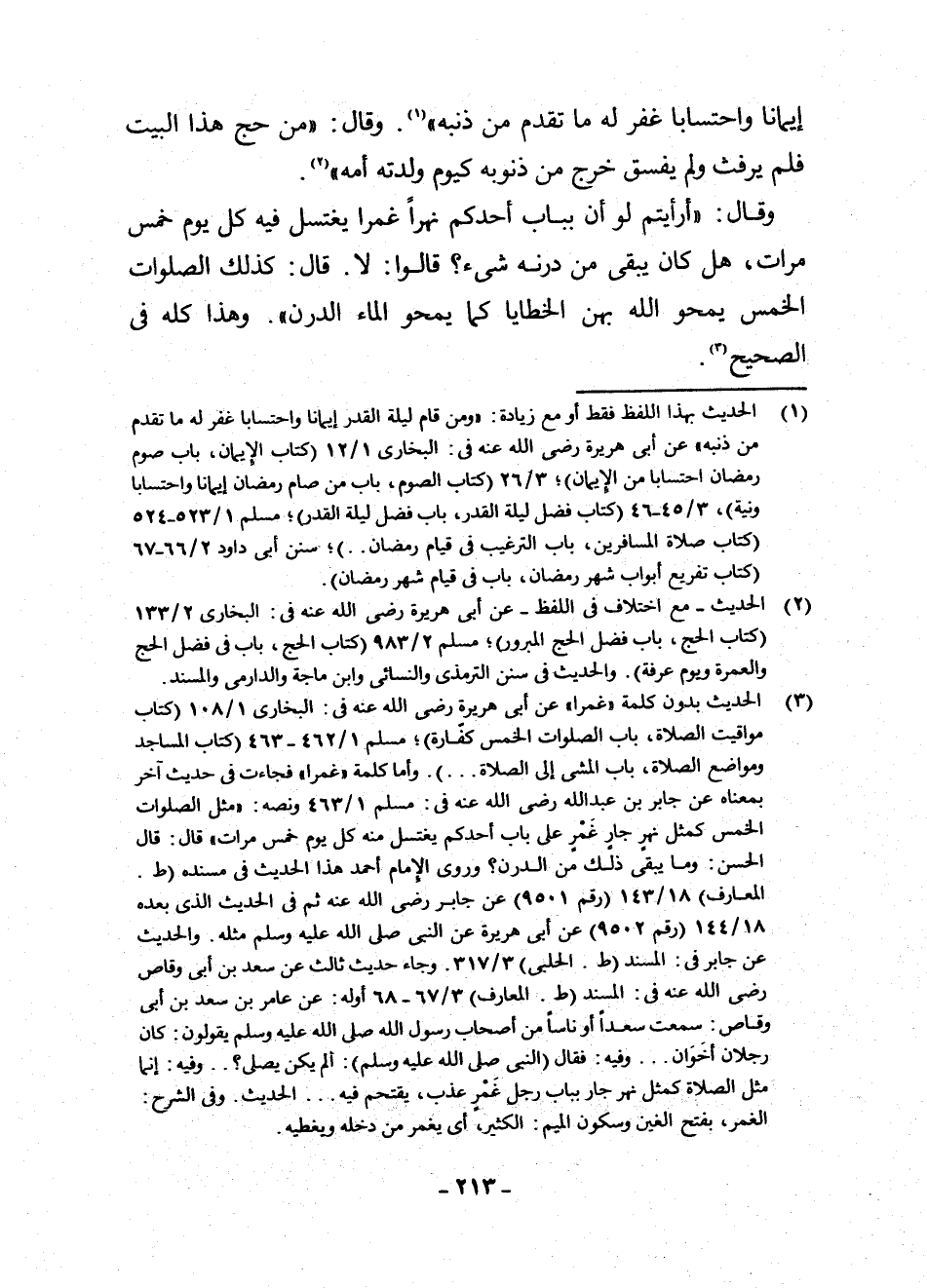 (¬3) الْحَدِيثُ بِدُونِ كَلِمَةِ " غَمْرًا " عَنْ أَبِي هُرَيْرَةَ رَضِيَ اللَّهُ عَنْهُ فِي الْبُخَارِيِّ 1/108 (كِتَابُ مَوَاقِيتِ الصَّلَاةِ، بَابٌ الصَّلَوَاتُ الْخَمْسِ كَفَّارَةٌ) ؛ مُسْلِمٍ 1/462 - 463 (كِتَابُ الْمَسَاجِدِ وَمَوَاضِعِ الصَّلَاةِ، بَابُ الْمَشْيِ إِلَى الصَّلَاةِ) وَأَمَّا كَلِمَةُ غَمْرًا فَجَاءَتْ فِي حَدِيثٍ آخَرَ بِمَعْنَاهُ عَنْ جَابِرِ بْنِ عَبْدِ اللَّهِ رَضِيَ اللَّهُ عَنْهُ فِي مُسْلِمٍ 1/463 وَنَصُّهُ: مَثَلُ الصَّلَوَاتِ الْخَمْسِ كَمَثَلِ نَهْرٍ جَارٍ غَمْرٍ عَلَى بَابِ أَحَدِكُمْ يَغْتَسِلُ مِنْهُ كُلَّ يَوْمٍ خَمْسَ مَرَّاتٍ. قَالَ: قَالَ الْحَسَنُ: وَمَا يُبْقِي ذَلِكَ مِنَ الدَّرَنِ؟ ! وَرَوَى الْإِمَامُ أَحْمَدُ هَذَا الْحَدِيثَ فِي مَسْنَدِهِ ط. الْمَعَارِفِ 18 143 رَقْمَ 9501 عَنْ جَابِرٍ رَضِيَ اللَّهُ عَنْهُ ثُمَّ فِي الْحَدِيثِ الَّذِي بَعْدَهُ 18 144 رَقْمِ 9502 عَنْ أَبِي هُرَيْرَةَ عَنِ النَّبِيِّ صَلَّى اللَّهُ عَلَيْهِ وَسَلَّمَ مِثْلَهُ، وَالْحَدِيثُ عَنْ جَابِرٍ فِي الْمُسْنَدِ ط. الْحَلَبِيِّ 3/317 وَجَاءَ حَدِيثٌ ثَالِثٌ عَنْ سَعْدِ بْنِ أَبِي وَقَّاصٍ رَضِيَ اللَّهُ عَنْهُ فِي: الْمُسْنَدِ ط. الْمَعَارِفِ 3/67 - 68 أَوَّلُهُ: عَنْ عَامِرِ بْنِ سَعْدِ بْنِ أَبِي وَقَّاصٍ: سَمِعْتُ سَعْدًا أَوْ نَاسًا مِنْ أَصْحَابِ رَسُولِ اللَّهِ صَلَّى اللَّهُ عَلَيْهِ وَسَلَّمَ يَقُولُونَ: كَانَ رَجُلَانِ أَخَوَانِ. . . . وَفِيهِ فَقَالَ النَّبِيُّ صَلَّى اللَّهُ عَلَيْهِ وَسَلَّمَ أَلَمْ يَكُنْ يُصَلِّي؟ . . وَفِيهِ: إِنَّمَا مَثَلُ الصَّلَاةِ كَمَثَلِ نَهْرٍ جَارٍ بِبَابِ رَجُلٍ غَمْرٍ عَذْبٍ، يَقْتَحِمُ فِيهِ. . . .، الْحَدِيثَ. وَفِي الشَّرْحِ: الْغَمْرُ: بِفَتْحِ الْغَيْنِ وَسُكُونِ الْمِيمِ: الْكَثِيرُ، أَيْ: يَغْمُرُ مَنْ دَخَلَهُ وَيُغَطِّيهِ.