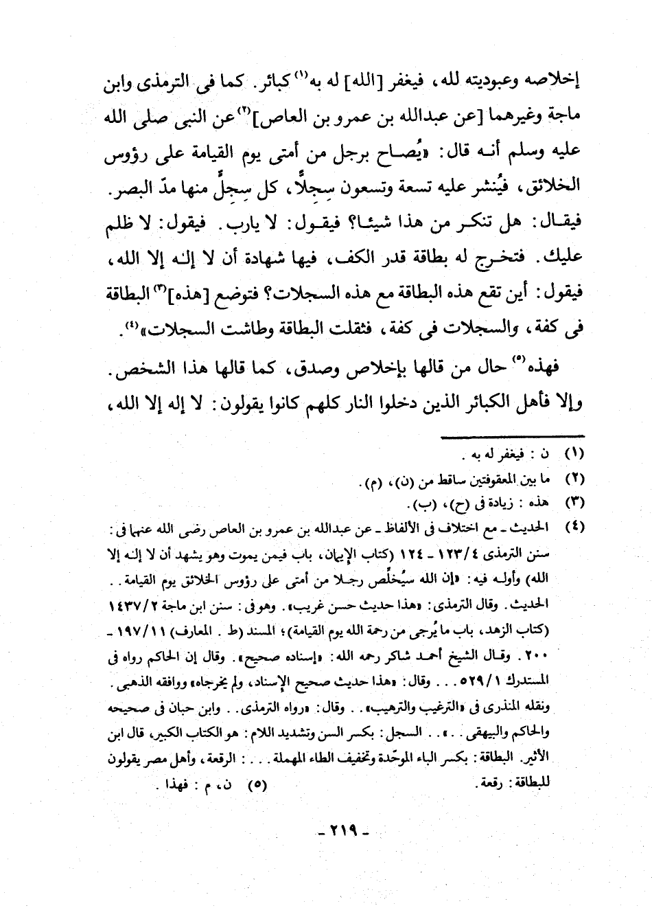 (¬4) الْحَدِيثُ مَعَ اخْتِلَافٍ فِي الْأَلْفَاظِ عَنْ عَبْدِ اللَّهِ بْنِ عَمْرِو بْنِ الْعَاصِ رَضِيَ اللَّهُ عَنْهُمَا فِي: سُنَنِ التِّرْمِذِيِّ 4/123 - 124 (كِتَابُ الْإِيمَانِ، بَابٌ فِيمَنْ يَمُوتُ وَهُوَ يَشْهَدُ أَنْ لَا إِلَهَ إِلَّا اللَّهُ) وَأَوَّلُهُ فِيهِ: إِنَّ اللَّهَ سَيُخَلِّصُ رَجُلًا مِنْ أُمَّتِي عَلَى رُءُوسِ الْخَلَائِقِ يَوْمَ الْقِيَامَةِ. الْحَدِيثَ، وَقَالَ التِّرْمِذِيُّ: هَذَا حَدِيثٌ حَسَنٌ غَرِيبٌ. وَهُوَ فِي سُنَنِ ابْنِ مَاجَهْ 2/1437 (كِتَابُ الزُّهْدِ، بَابُ مَا يُرْجَى مِنْ رَحْمَةِ اللَّهِ يَوْمَ الْقِيَامَةِ) ؛ الْمُسْنَدِ ط. الْمَعَارِفِ 11 197 - 200 وَقَالَ الشَّيْخُ أَحْمَد شَاكِر رَحِمَهُ اللَّهُ: إِسْنَادُهُ صَحِيحٌ، وَقَالَ: إِنَّ الْحَاكِمَ رَوَاهُ فِي الْمُسْتَدْرَكِ 1/529 وَقَالَ: هَذَا حَدِيثٌ صَحِيحُ الْإِسْنَادِ وَلَمْ يُخَرِّجَاهُ، وَوَافَقَهُ الذَّهَبِيُّ. وَنَقَلَهُ الْمُنْذِرِيُّ فِي التَّرْغِيبِ وَالتَّرْهِيبِ، وَقَالَ: رَوَاهُ التِّرْمِذِيُّ وَابْنُ حِبَّانَ فِي صَحِيحِهِ وَالْحَاكِمُ وَالْبَيْهَقِيُّ،. . . . السِّجِلُّ بِكَسْرِ السِّينِ وَتَشْدِيدِ اللَّامِ: هُوَ الْكِتَابُ الْكَبِيرُ، قَالَ ابْنُ الْأَثِيرِ: الْبِطَاقَةُ - بِكَسْرِ الْبَاءِ الْمُوَحَّدَةِ وَتَخْفِيفِ الطَّاءِ الْمُهْمَلَةِ - الرُّقْعَةُ، وَأَهْلُ مِصْرَ يَقُولُونَ لِلْبِطَاقَةِ: رُقْعَةٌ.