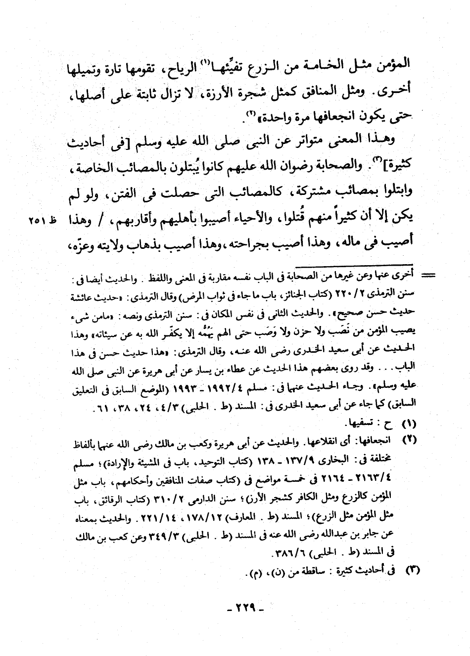 (¬2) انْجِعَافُهَا: أَيِ انْقِلَاعُهَا، وَالْحَدِيثُ عَنْ أَبِي هُرَيْرَةَ وَكَعْبِ بْنِ مَالِكٍ رَضِيَ اللَّهُ عَنْهُمَا بِأَلْفَاظٍ مُخْتَلِفَةٍ فِي: الْبُخَارِيِّ 9/137 - 138 (كِتَابُ التَّوْحِيدِ، بَابٌ فِي الْمَشِيئَةِ وَالْإِرَادَةِ) ؛ مُسْلِمٍ 4/2163، 2164 فِي خَمْسَةِ مَوَاضِعَ فِي: (كِتَابُ صِفَاتِ الْمُنَافِقِينَ وَأَحْكَامِهِمْ، بَابٌ مَثَلُ الْمُؤْمِنِ كَالزَّرْعِ وَمَثَلُ الْكَافِرِ كَشَجَرِ الْأَرُزِّ) ؛ سُنَنِ الدَّارِمِيِّ 2/310 (كِتَابُ الرَّقَائِقِ، بَابٌ مَثَلُ الْمُؤْمِنِ مَثَلُ الزَّرْعِ) ؛ الْمُسْنَدِ ط. الْمَعَارِفِ 12 178، 14 221 وَالْحَدِيثُ بِمَعْنَاهُ عَنْ جَابِرِ بْنِ عَبْدِ اللَّهِ رَضِيَ اللَّهُ عَنْهُ فِي الْمُسْنَدِ ط. الْحَلَبِيِّ 3/349 وَعَنْ كَعْبِ بْنِ مَالِكٍ فِي الْمُسْنَدِ ط. الْحَلَبِيِّ 6/386
