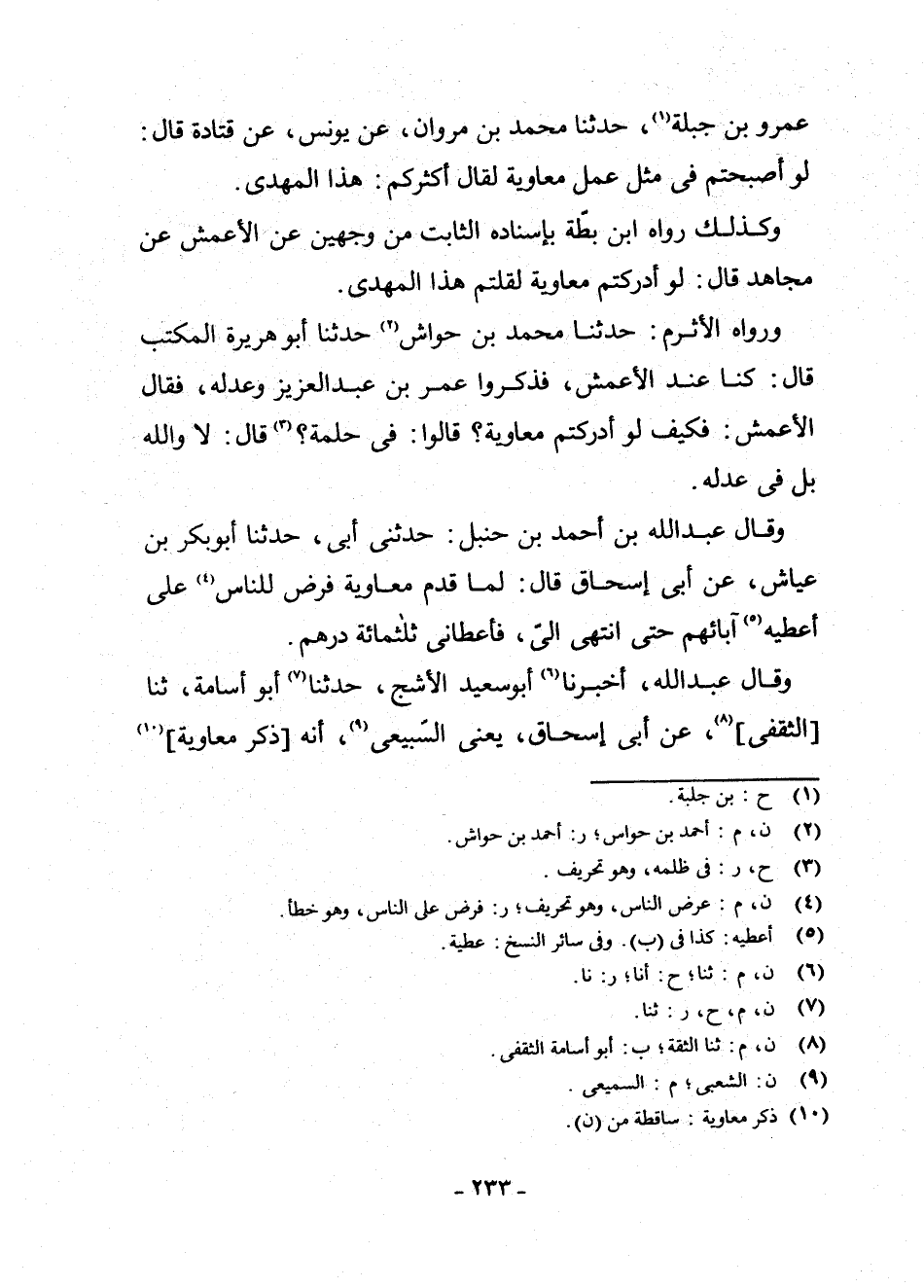 وَرَوَاهُ الْأَثْرَمُ: حَدَّثَنَا مُحَمَّدُ بْنُ حَوَّاشٍ (¬2) ، حَدَّثَنَا أَبُو هُرَيْرَةَ الْمُكْتِبُ قَالَ: كُنَّا عِنْدَ الْأَعْمَشِ، فَذَكَرُوا عُمَرَ بْنَ عَبْدِ الْعَزِيزِ وَعَدْلَهُ، فَقَالَ الْأَعْمَشُ: فَكَيْفَ لَوْ أَدْرَكْتُمْ مُعَاوِيَةَ؟ قَالُوا: فِي حِلْمِهِ؟ (¬3) قَالَ: لَا وَاللَّهِ، بَلْ فِي عَدْلِهِ.