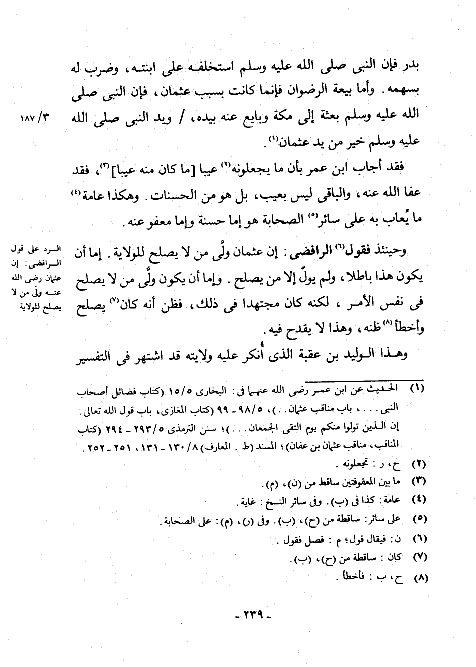 (¬1) الْحَدِيثُ عَنِ ابْنِ عُمَرَ رَضِيَ اللَّهُ عَنْهُمَا فِي الْبُخَارِيِّ 5/15 (كِتَابُ فَضَائِلِ أَصْحَابِ النَّبِيِّ، بَابُ مَنَاقِبِ عُثْمَانَ) 5/98 - 99 (كِتَابُ الْمَغَازِي، بَابُ قَوْلِ اللَّهِ تَعَالَى: إِنَّ الَّذِينَ تَوَلَّوْا مِنْكُمْ يَوْمَ الْتَقَى الْجَمْعَانِ) ؛ سُنَنِ التِّرْمِذِيِّ 5/293 - 294 (كِتَابُ الْمَنَاقِبِ، مَنَاقِبُ عُثْمَانَ بْنِ عَفَّانَ) ؛ الْمُسْنَدِ ط. الْمَعَارِفِ 8/130 - 131، 251 - 252.