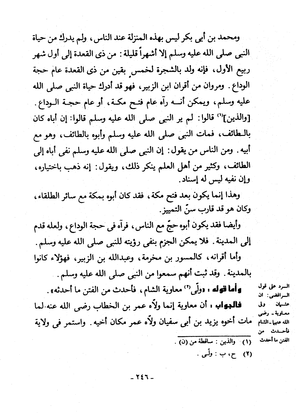 وَمُحَمَّدُ بْنُ أَبِي بَكْرٍ لَيْسَ بِهَذِهِ الْمَنْزِلَةِ عِنْدَ النَّاسِ، وَلَمْ يُدْرِكْ مِنْ حَيَاةِ النَّبِيِّ - صَلَّى اللَّهُ عَلَيْهِ وَسَلَّمَ - إِلَّا أَشْهُرًا قَلِيلَةً: مِنْ ذِي الْقِعْدَةِ إِلَى أَوَّلِ شَهْرِ رَبِيعٍ الْأَوَّلِ، فَإِنَّهُ وُلِدَ بِالشَّجَرَةِ لِخَمْسٍ بَقِينَ مِنْ ذِي الْقَعْدَةِ عَامَ حَجَّةِ الْوَدَاعِ. وَمَرْوَانُ مِنْ أَقْرَانِ ابْنِ الزُّبَيْرِ، فَهُوَ قَدْ أَدْرَكَ حَيَاةَ النَّبِيِّ صَلَّى اللَّهُ عَلَيْهِ وَسَلَّمَ، وَيُمْكِنُ أَنَّهُ رَآهُ عَامَ فَتْحِ مَكَّةَ، أَوْ عَامَ حَجَّةِ الْوَدَاعِ. [وَالَّذِينَ] (¬1) قَالُوا: لَمْ يَرَ النَّبِيَّ - صَلَّى اللَّهُ عَلَيْهِ وَسَلَّمَ - قَالُوا: إِنَّ أَبَاهُ كَانَ بِالطَّائِفِ، فَمَاتَ النَّبِيُّ - صَلَّى اللَّهُ عَلَيْهِ وَسَلَّمَ - وَأَبُوهُ بِالطَّائِفِ، وَهُوَ مَعَ أَبِيهِ. وَمِنَ النَّاسِ مَنْ يَقُولُ: إِنَّ النَّبِيَّ - صَلَّى اللَّهُ عَلَيْهِ وَسَلَّمَ - نَفَى أَبَاهُ إِلَى الطَّائِفِ، وَكَثِيرٌ مِنْ أَهْلِ الْعِلْمِ يُنْكِرُ ذَلِكَ، وَيَقُولُ: إِنَّهُ ذَهَبَ بِاخْتِيَارِهِ، وَإِنَّ نَفْيَهُ لَيْسَ لَهُ إِسْنَادٌ.