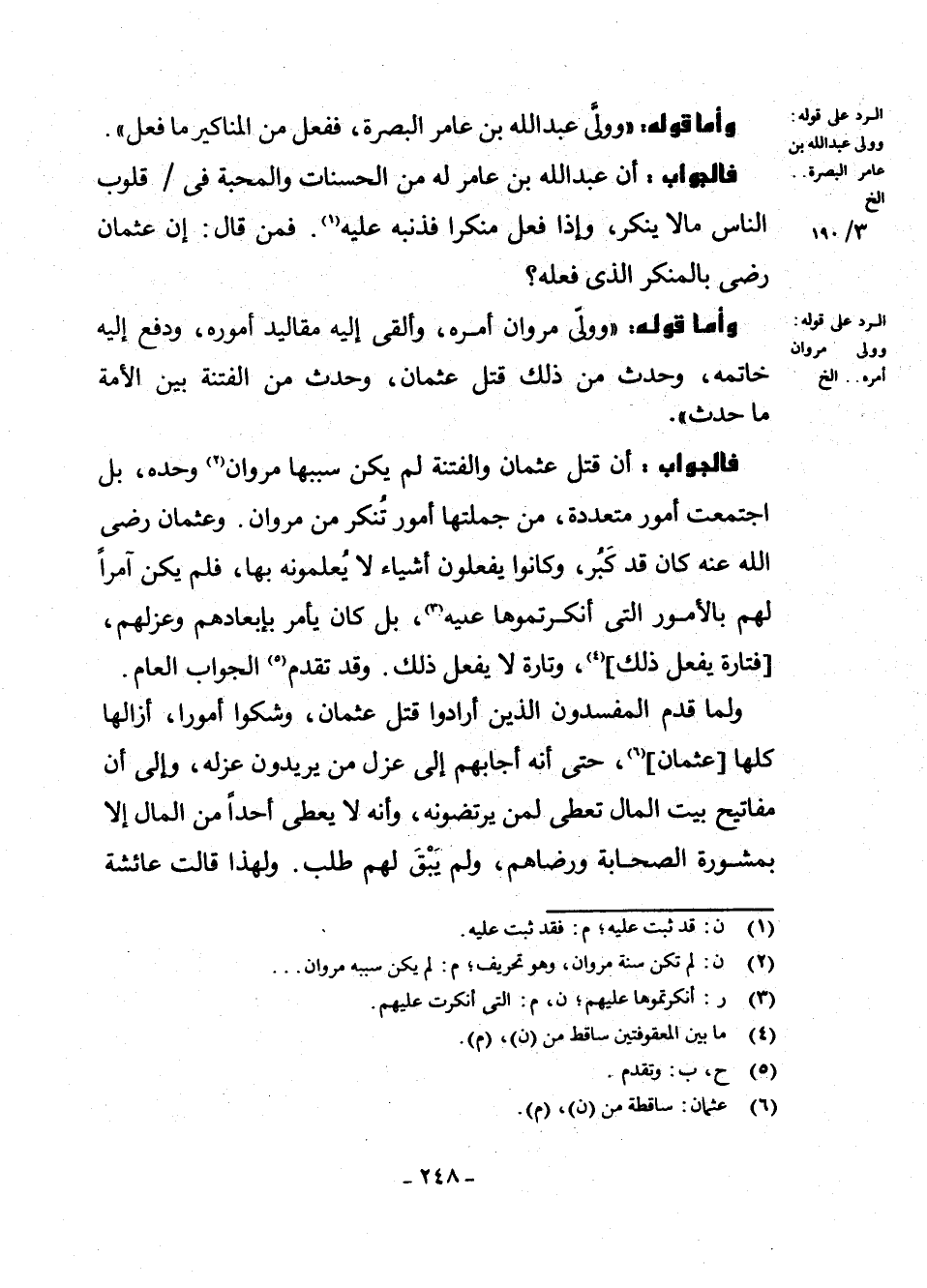 فَالْجَوَابُ: أَنَّ قَتْلَ عُثْمَانَ وَالْفِتْنَةَ لَمْ يَكُنْ سَبَبُهَا مَرْوَانَ (¬2) وَحْدَهُ، بَلِ اجْتَمَعَتْ أُمُورٌ مُتَعَدِّدَةٌ، مِنْ جُمْلَتِهَا أُمُورٌ تُنْكَرُ مِنْ مَرْوَانَ. وَعُثْمَانَ - رَضِيَ اللَّهُ عَنْهُ - كَانَ قَدْ كَبُرَ، وَكَانُوا يَفْعَلُونَ أَشْيَاءَ لَا يُعْلِمُونَهُ بِهَا، فَلَمْ يَكُنْ آمِرًا لَهُمْ بِالْأُمُورِ الَّتِي أَنْكَرْتُمُوهَا عَلَيْهِ (¬3) ، بَلْ كَانَ يَأْمُرُ بِإِبْعَادِهِمْ وَعَزْلِهِمْ، [فَتَارَةً يَفْعَلُ ذَلِكَ] (¬4) ، وَتَارَةً لَا يَفْعَلُ ذَلِكَ. وَقَدْ تَقَدَّمَ (¬5) الْجَوَابُ الْعَامُّ.