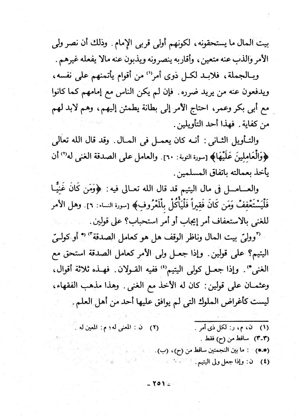 (3 وَوَلِيُّ بَيْتِ الْمَالِ وَنَاظِرُ الْوَقْفِ هَلْ هُوَ كَعَامِلِ الصَّدَقَةِ 3) (¬3) (* أَوْ كَوَلِيِّ الْيَتِيمِ؟ عَلَى قَوْلَيْنِ. وَإِذَا جُعِلَ وَلِيُّ الْأَمْرِ كَعَامِلِ الصَّدَقَةِ اسْتَحَقَّ مَعَ الْغِنَى *) (¬4) . وَإِذَا جُعِلَ كَوَلِيِّ الْيَتِيمِ (¬5) فَفِيهِ الْقَوْلَانِ. فَهَذِهِ ثَلَاثَةُ أَقْوَالٍ، وَعُثْمَانُ عَلَى قَوْلَيْنِ: كَانَ لَهُ الْأَخْذُ مَعَ الْغِنَى. وَهَذَا مَذْهَبُ الْفُقَهَاءِ، لَيْسَتْ كَأَغْرَاضِ الْمُلُوكِ الَّتِي لَمْ يُوَافِقْ عَلَيْهَا أَحَدٌ مِنْ أَهْلِ الْعِلْمِ.