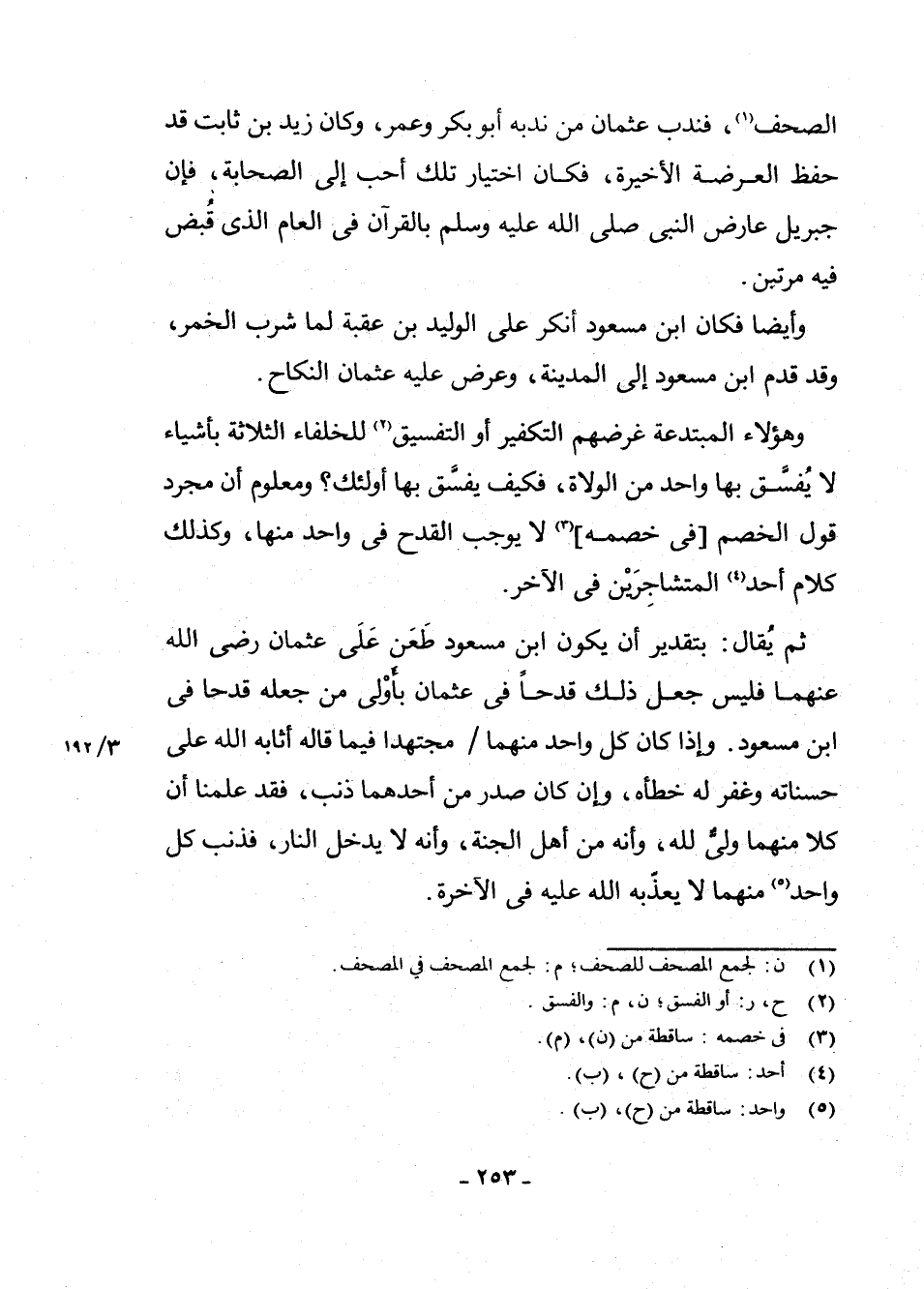 ثُمَّ يُقَالُ: بِتَقْدِيرِ أَنْ يَكُونَ ابْنُ مَسْعُودٍ طَعَنَ عَلَى عُثْمَانَ - رَضِيَ اللَّهُ عَنْهُمَا - فَلَيْسَ جَعْلُ ذَلِكَ قَدْحًا فِي عُثْمَانَ بِأَوْلَى مِنْ جَعْلِهِ قَدْحًا فِي ابْنِ مَسْعُودٍ. وَإِذَا كَانَ كُلُّ وَاحِدٍ مِنْهُمَا مُجْتَهِدًا فِيمَا قَالَهُ أَثَابَهُ اللَّهُ عَلَى حَسَنَاتِهِ وَغَفَرَ لَهُ خَطَأَهُ، وَإِنْ كَانَ صَدَرَ مِنْ أَحَدِهِمَا ذَنْبٌ، فَقَدْ عَلِمْنَا أَنَّ كُلًّا مِنْهُمَا وَلِيٌّ لِلَّهِ، وَأَنَّهُ مِنْ أَهْلِ الْجَنَّةِ، وَأَنَّهُ لَا يَدْخُلُ النَّارَ، فَذَنْبُ كُلِّ وَاحِدٍ (¬5) مِنْهُمَا لَا يُعَذِّبُهُ اللَّهُ عَلَيْهِ فِي الْآخِرَةِ.