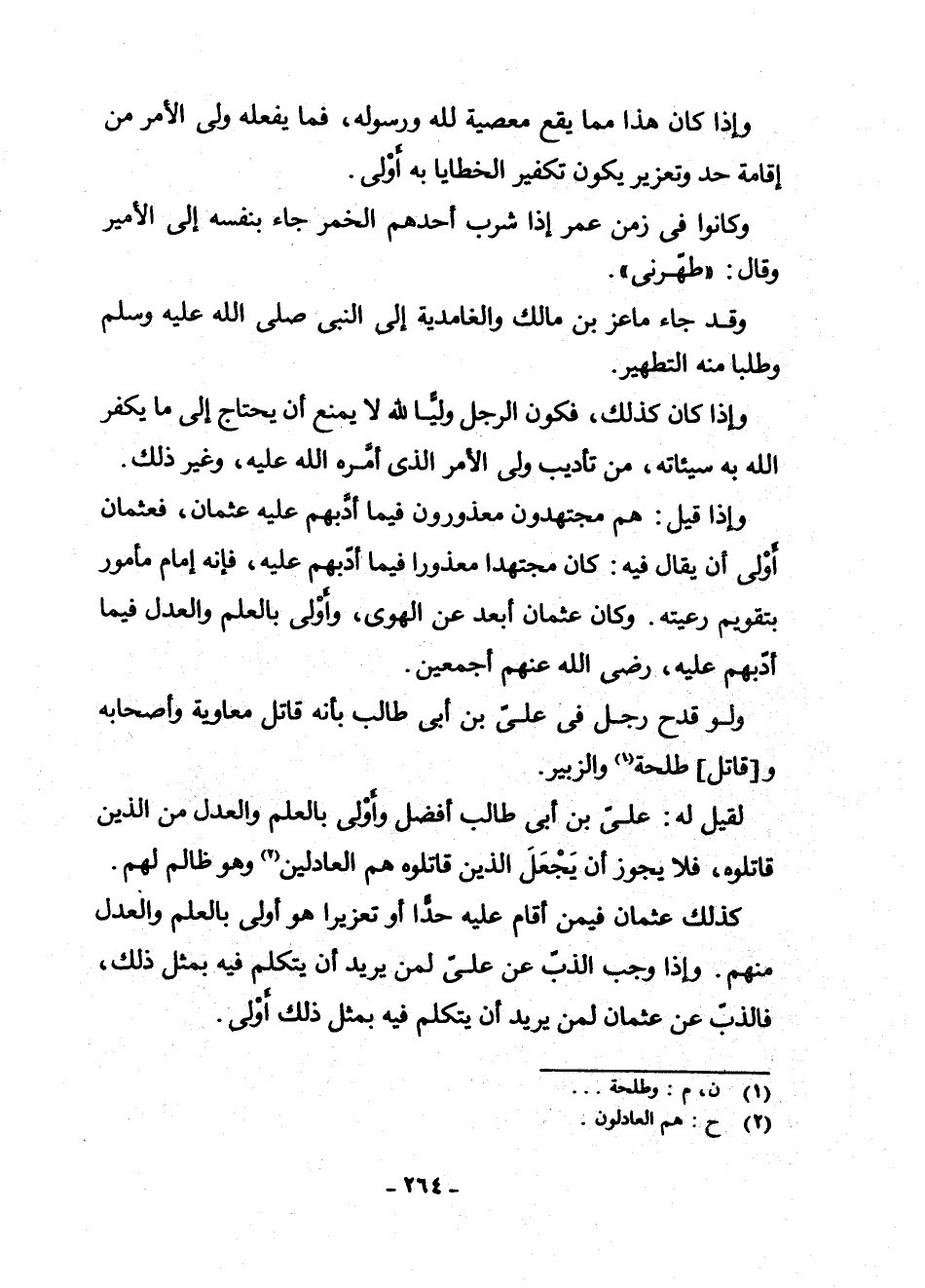 كَذَلِكَ عُثْمَانُ فِيمَنْ أَقَامَ عَلَيْهِ حَدًّا أَوْ تَعْزِيرًا هُوَ أَوْلَى بِالْعِلْمِ وَالْعَدْلِ مِنْهُمْ. وَإِذَا وَجَبَ الذَّبُّ عَنْ عَلِيٍّ لِمَنْ يُرِيدُ أَنْ يَتَكَلَّمَ فِيهِ بِمِثْلِ ذَلِكَ، فَالذَّبُّ عَنْ عُثْمَانَ لِمَنْ يُرِيدُ أَنْ يَتَكَلَّمَ فِيهِ بِمِثْلِ ذَلِكَ أَوْلَى.
