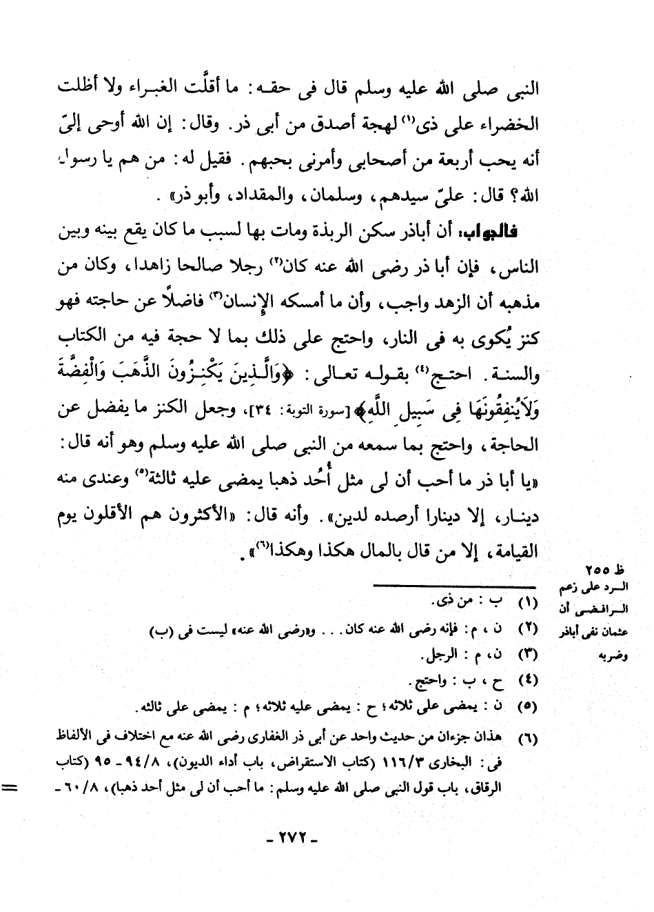 فَالْجَوَابُ: أَنَّ أَبَا ذَرٍّ سَكَنَ الرَّبَذَةَ وَمَاتَ بِهَا لِسَبَبِ مَا كَانَ يَقَعُ بَيْنَهُ وَبَيْنَ النَّاسِ، فَإِنَّ أَبَا ذَرٍّ - رَضِيَ اللَّهُ عَنْهُ - كَانَ (¬2) رَجُلًا صَالِحًا زَاهِدًا، وَكَانَ مِنْ مَذْهَبِهِ أَنَّ الزُّهْدَ وَاجِبٌ، وَأَنَّ مَا أَمْسَكَهُ الْإِنْسَانُ (¬3) فَاضِلًا عَنْ حَاجَتِهِ فَهُوَ كَنْزٌ يُكْوَى بِهِ فِي النَّارِ، وَاحْتَجَّ عَلَى ذَلِكَ بِمَا لَا حُجَّةَ فِيهِ مِنَ الْكِتَابِ وَالسُّنَّةِ. احْتَجَّ (¬4) بِقَوْلِهِ - تَعَالَى -: {وَالَّذِينَ يَكْنِزُونَ الذَّهَبَ وَالْفِضَّةَ وَلَا يُنْفِقُونَهَا فِي سَبِيلِ اللَّهِ} [سُورَةُ التَّوْبَةِ: 34] ، وَجَعَلَ الْكَنْزَ مَا يَفْضُلُ عَنِ الْحَاجَةِ، وَاحْتَجَّ بِمَا سَمِعَهُ مِنَ النَّبِيِّ - صَلَّى اللَّهُ عَلَيْهِ وَسَلَّمَ - وَهُوَ أَنَّهُ قَالَ: " «يَا أَبَا ذَرٍّ مَا أُحِبُّ أَنَّ لِي مِثْلَ أُحُدٍ ذَهَبًا يَمْضِي عَلَيْهِ ثَالِثَةٌ (¬5) وَعِنْدِي مِنْهُ دِينَارٌ، إِلَّا دِينَارًا أَرْصُدُهُ لِدَيْنٍ» ". وَأَنَّهُ قَالَ: " «الْأَكْثَرُونَ هُمُ الْأَقَلُّونَ يَوْمَ الْقِيَامَةِ، إِلَّا مَنْ قَالَ بِالْمَالِ هَكَذَا وَهَكَذَا» (¬6) ".