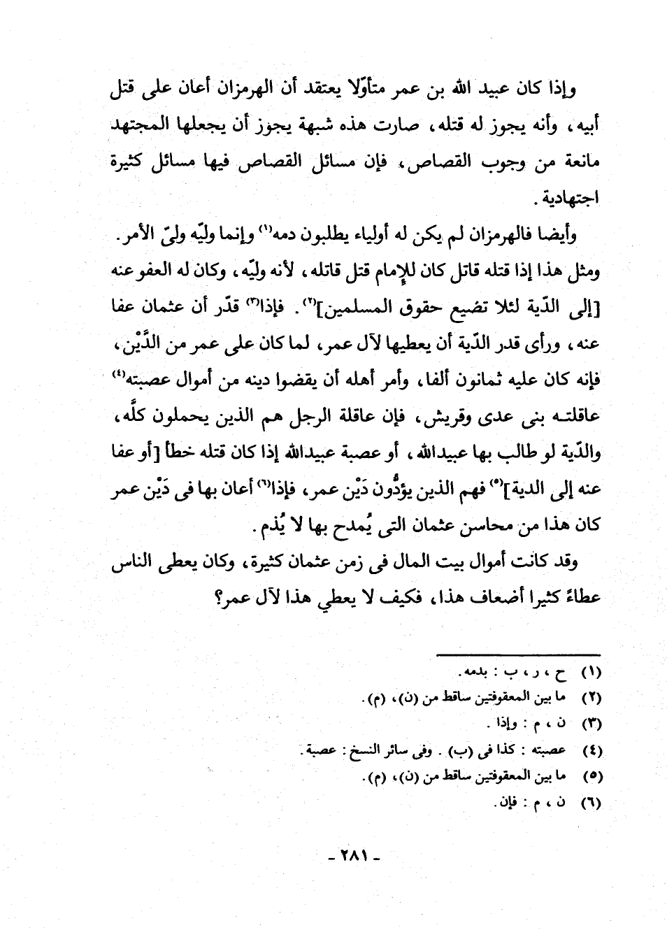 وَأَيْضًا فَالْهُرْمُزَانَ لَمْ يَكُنْ لَهُ أَوْلِيَاءٌ يَطْلُبُونَ دَمَهُ (¬1) وَإِنَّمَا وَلِيُّهُ وَلِيُّ الْأَمْرِ. وَمِثْلُ هَذَا إِذَا قَتَلَهُ قَاتِلٌ كَانَ لِلْإِمَامِ قَتْلُ قَاتِلِهِ، لِأَنَّهُ وَلَيُّهُ، وَكَانَ لَهُ الْعَفْوُ عَنْهُ [إِلَى الدِّيَةِ لِئَلَّا تَضِيعَ حُقُوقُ الْمُسْلِمِينَ] (¬2) . فَإِذَا (¬3) قُدِّرَ أَنَّ عُثْمَانَ عَفَا عَنْهُ، وَرَأَى قَدْرَ الدِّيَةَ أَنْ يُعْطِيَهَا لِآلِ عُمَرَ، لِمَا كَانَ عَلَى عُمَرَ مِنَ الدَّيْنِ، فَإِنَّهُ كَانَ عَلَيْهِ ثَمَانُونَ أَلْفًا، وَأَمَرَ أَهْلَهُ أَنْ يَقْضُوا دَيْنَهُ مِنْ أَمْوَالِ عَصَبَتِهِ (¬4) عَاقِلَتِهِ بَنِي عُدَيٍّ وَقُرَيْشٍ، فَإِنَّ عَاقِلَةَ الرَّجُلِ هُمُ الَّذِينَ يَحْمِلُونَ كَلَّهُ، وَالدِّيَةُ لَوْ طَالَبَ بِهَا عُبَيْدُ اللَّهِ، أَوْ عُصْبَةُ عُبَيْدِ اللَّهِ إِذَا كَانَ قَتْلُهُ خَطَأً [أَوْ عَفَا عَنْهُ إِلَى الدِّيَةِ] (¬5) فَهُمُ الَّذِينَ يُؤَدُّونَ دَيْنَ عُمَرَ، فَإِذَا (¬6) أَعَانَ بِهَا فِي دَيْنِ عُمَرَ كَانَ هَذَا مِنْ مَحَاسِنِ عُثْمَانَ الَّتِي يُمْدَحُ بِهَا لَا يُذَمُّ.
