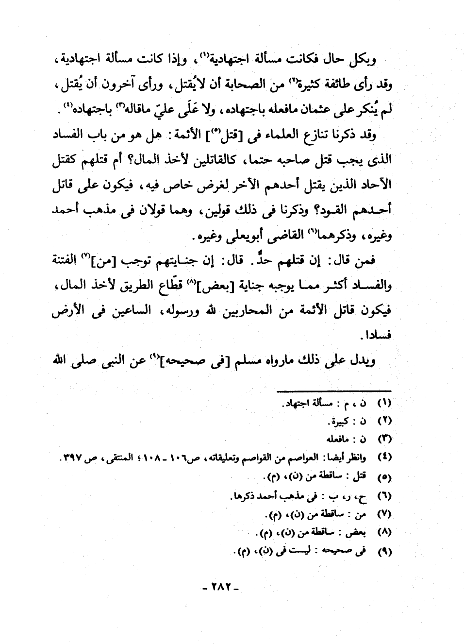 وَبِكُلِّ حَالٍ فَكَانَتْ مَسْأَلَةً اجْتِهَادِيَّةً (¬1) ، وَإِذَا كَانَتْ مَسْأَلَةً اجْتِهَادِيَّةً، وَقَدْ رَأَى طَائِفَةٌ كَثِيرَةٌ (¬2) مِنَ الصَّحَابَةِ أَنْ لَا يُقْتَلَ، وَرَأَى آخَرُونَ أَنْ يُقْتَلَ، لَمْ يُنْكَرْ عَلَى عُثْمَانَ مَا فَعَلَهُ بِاجْتِهَادِهِ، وَلَا عَلَى عَلِيٍّ مَا قَالَهُ (¬3) بِاجْتِهَادِهِ (¬4) .