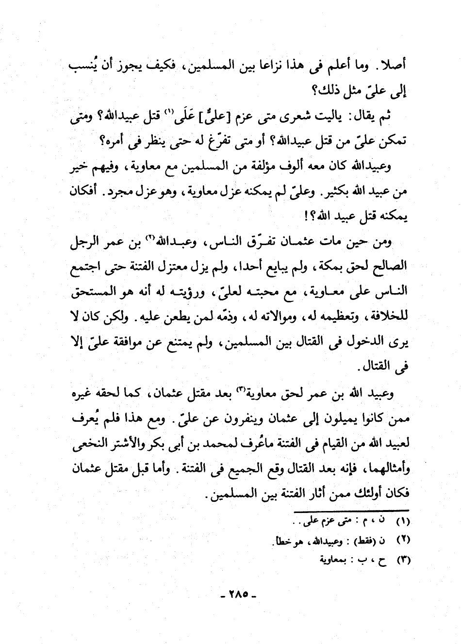وَعُبَيْدُ اللَّهِ بْنُ عُمَرَ لِحَقَ مُعَاوِيَةَ (¬3) بَعْدَ مَقْتَلِ عُثْمَانَ، كَمَا لَحِقَهُ غَيْرُهُ مِمَّنْ كَانُوا يَمِيلُونَ إِلَى عُثْمَانَ وَيَنْفِرُونَ عَنْ عَلِيٍّ. وَمَعَ هَذَا فَلَمْ يُعْرَفْ لِعُبَيْدِ اللَّهِ مِنَ الْقِيَامِ فِي الْفِتْنَةِ مَا عُرِفَ لِمُحَمَّدِ بْنِ أَبِي بَكْرٍ، وَالْأَشْتَرِ النَّخَعِيِّ وَأَمْثَالِهِمَا، فَإِنَّهُ بَعْدَ الْقِتَالِ وَقَعَ الْجَمِيعُ فِي الْفِتْنَةِ. وَأَمَّا قَبْلَ مَقْتَلِ عُثْمَانَ فَكَانَ أُولَئِكَ مِمَّنْ أَثَارَ الْفِتْنَةَ بَيْنَ الْمُسْلِمِينَ.