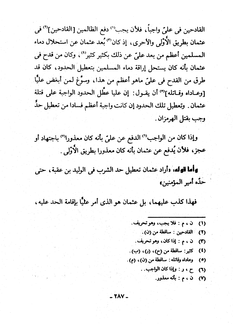 وَإِذَا كَانَ مِنَ الْوَاجِبِ (¬6) الدَّفْعُ عَنْ عَلِيٍّ بِأَنَّهُ كَانَ مَعْذُورًا (¬7) بِاجْتِهَادٍ أَوْ عَجْزٍ، فَلَأَنْ يُدْفَعَ عَنْ عُثْمَانَ بِأَنَّهُ كَانَ مَعْذُورًا بِطَرِيقِ الْأَوْلَى.