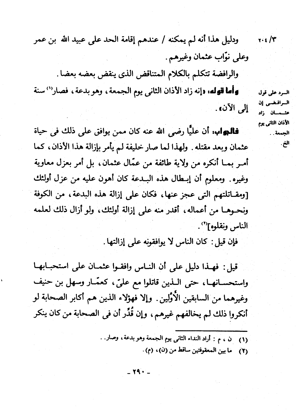 فَالْجَوَابُ: أَنَّ عَلِيًّا - رَضِيَ اللَّهُ عَنْهُ - كَانَ مِمَّنْ يُوَافِقُ عَلَى ذَلِكَ فِي حَيَاةِ عُثْمَانَ وَبَعْدَ مَقْتَلِهِ. وَلِهَذَا لَمَّا صَارَ خَلِيفَةً لَمْ يَأْمُرْ بِإِزَالَةِ هَذَا الْأَذَانِ، كَمَا أَمَرَ بِمَا أَنْكَرَهُ مِنْ وِلَايَةِ طَائِفَةٍ مِنْ عُمَّالِ عُثْمَانَ، بَلْ أَمَرَ بِعَزْلِ مُعَاوِيَةَ وَغَيْرِهِ. وَمَعْلُومٌ أَنَّ إِبْطَالَ هَذِهِ الْبِدْعَةِ كَانَ أَهْوَنَ عَلَيْهِ مِنْ عَزْلِ أُولَئِكَ [وَمُقَاتَلَتِهِمُ الَّتِي عَجَزَ عَنْهَا، فَكَانَ عَلَى إِزَالَةِ هَذِهِ الْبِدْعَةِ مِنَ الْكُوفَةِ وَنَحْوِهَا مِنْ أَعْمَالِهِ أَقْدَرَ مِنْهُ عَلَى إِزَالَةِ أُولَئِكَ، وَلَوْ أَزَالَ ذَلِكَ لَعَلِمَهُ النَّاسُ وَنَقَلُوهُ] (¬2) .
