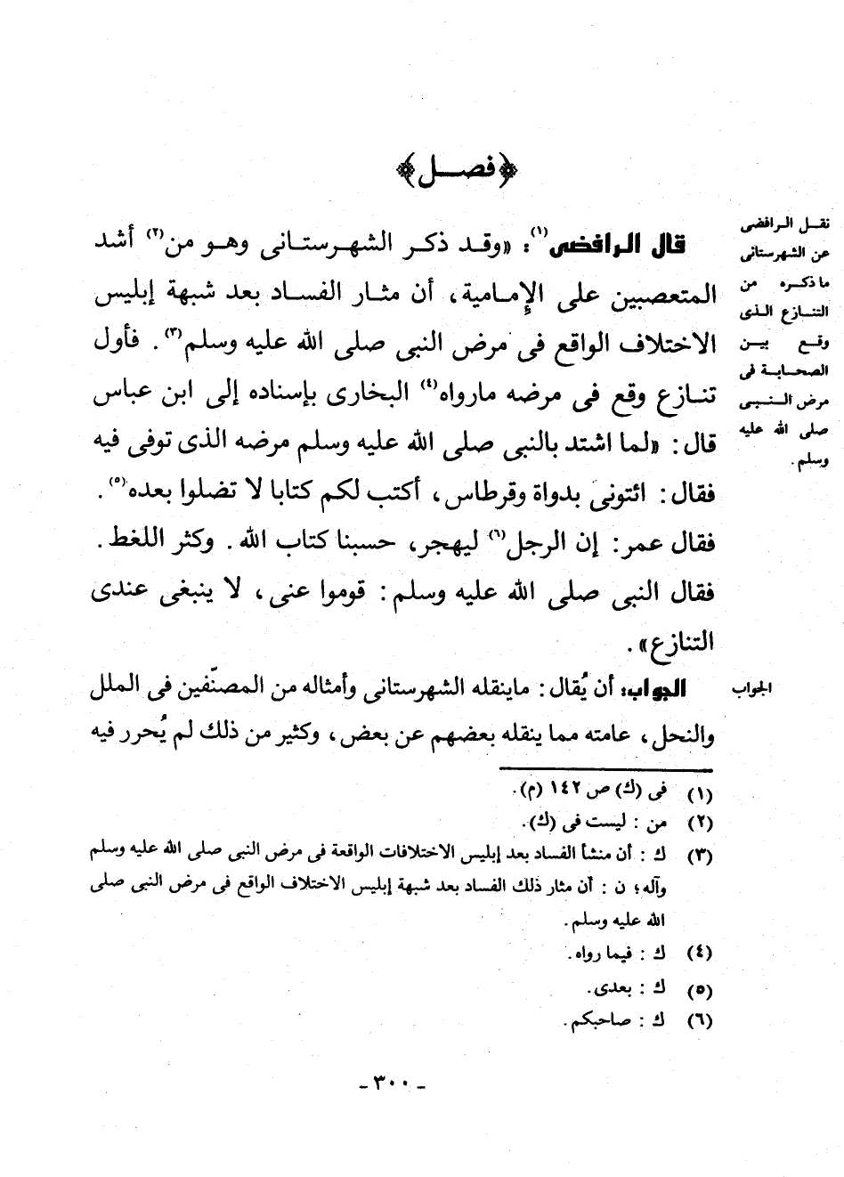 قَالَ الرَّافِضِيُّ (¬1) : " وَقَدْ ذَكَرَ الشَّهْرَسْتَانِيُّ وَهُوَ مِنْ (¬2) أَشَدِّ الْمُتَعَصِّبِينَ عَلَى الْإِمَامِيَّةِ، أَنَّ مَثَارَ الْفَسَادِ بَعْدَ شُبْهَةِ إِبْلِيسَ الِاخْتِلَافُ الْوَاقِعُ فِي مَرَضِ النَّبِيِّ - صَلَّى اللَّهُ عَلَيْهِ وَسَلَّمَ - (¬3) . فَأَوَّلُ تَنَازُعٍ وَقَعَ فِي مَرَضِهِ مَا رَوَاهُ (¬4) الْبُخَارِيُّ بِإِسْنَادِهِ إِلَى ابْنِ عَبَّاسٍ قَالَ: " «لَمَّا اشْتَدَّ بِالنَّبِيِّ - صَلَّى اللَّهُ عَلَيْهِ وَسَلَّمَ - مَرَضُهُ الَّذِي تُوُفِّيَ فِيهِ فَقَالَ: ائْتُونِي بِدَوَاةٍ وَقِرْطَاسٍ، أَكْتُبُ لَكُمْ كِتَابًا لَا تَضِلُّوا بَعْدَهُ (¬5) .