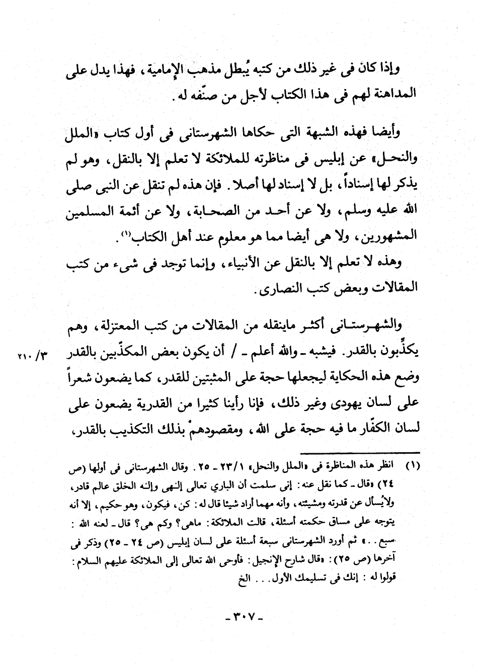 (¬1) انْظُرْ هَذِهِ الْمُنَاظَرَةَ فِي الْمِلَلِ وَالنِّحَلِ 1/23 - 25 وَقَالَ الشَّهْرَسْتَانِيُّ فِي أَوَّلِهَا (ص 24) قَالَ كَمَا نُقِلَ عَنْهُ: إِنِّي سَلَّمْتُ أَنَّ الْبَارِي تَعَالَى إِلَهِي وَإِلَهَ الْخَلْقِ عَالِمٌ قَادِرٌ، وَلَا يُسْأَلُ عَنْ قُدْرَتِهِ وَمَشِيئَتِهِ، وَأَنَّهُ مَهْمَا أَرَادَ شَيْئًا قَالَ لَهُ: كُنْ فَيَكُونُ، وَهُوَ حَكِيمٌ، إِلَّا أَنَّهُ يَتَوَجَّهُ عَلَى مَسَاقِ حِكْمَتِهِ أَسْئِلَةٌ، قَالَتِ الْمَلَائِكَةُ: مَا هِيَ؟ وَكَمْ هِيَ؟ قَالَ لَعَنَهُ اللَّهُ: سَبْعٌ. ثُمَّ أَوْرَدَ الشَّهْرَسْتَانِيُّ سَبْعَةَ أَسْئِلَةٍ عَلَى لِسَانِ إِبْلِيسَ (ص 24 - 25) وَذَكَرَ فِي آخِرِهَا (ص 25) : قَالَ شَارِحُ الْإِنْجِيلِ: فَأَوْحَى اللَّهُ تَعَالَى إِلَى الْمَلَائِكَةِ عَلَيْهِمُ السَّلَامُ: قُولُوا لَهُ: إِنَّكَ فِي تَسْلِيمِكَ الْأَوَّلِ. . . . إِلَخْ.