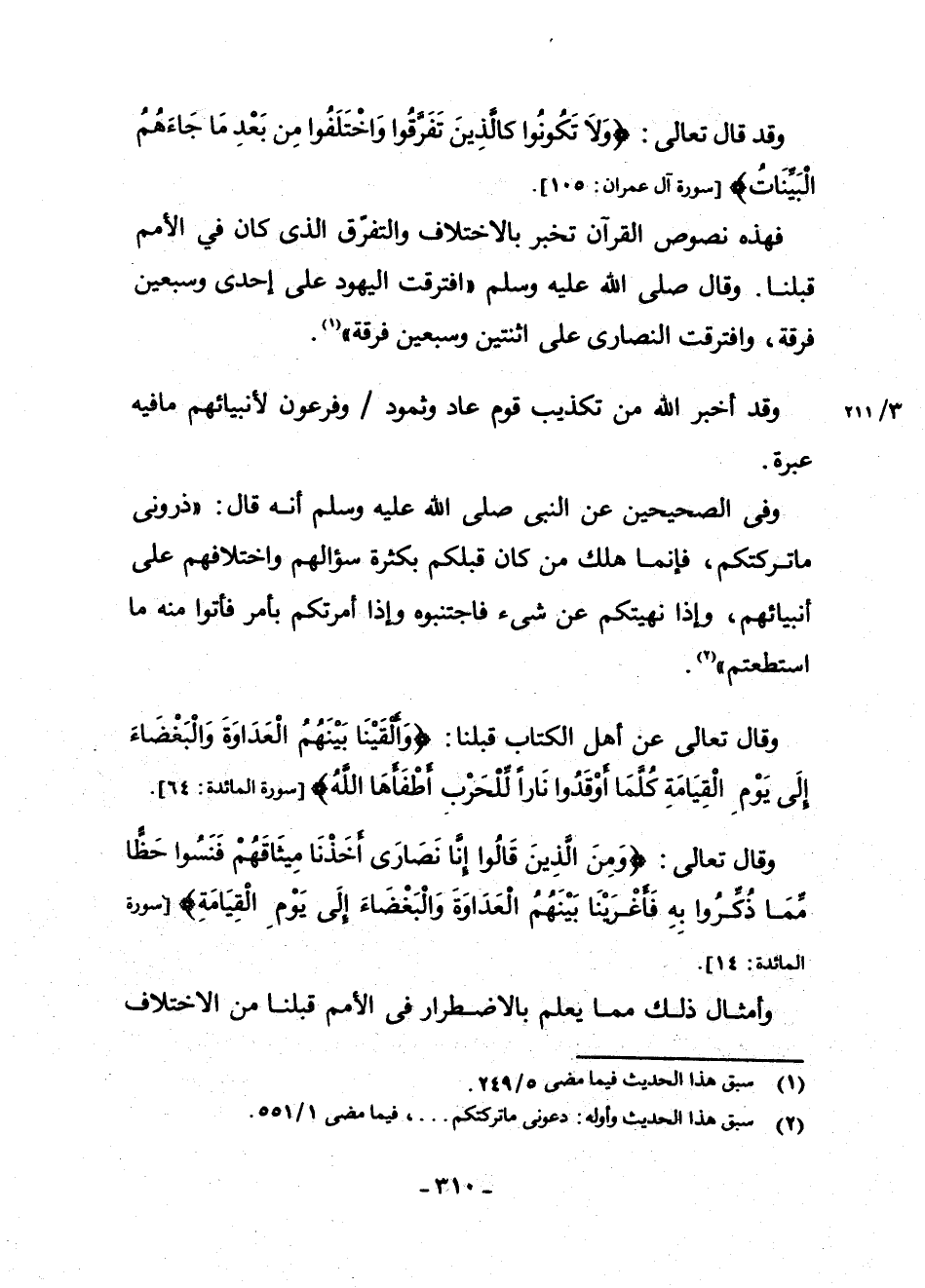 فَهَذِهِ نُصُوصُ الْقُرْآنِ تُخْبِرُ بِالِاخْتِلَافِ وَالتَّفَرُّقِ الَّذِي كَانَ فِي الْأُمَمِ قَبْلَنَا. وَقَالَ - صَلَّى اللَّهُ عَلَيْهِ وَسَلَّمَ -: " افْتَرَقَتِ الْيَهُودُ عَلَى إِحْدَى وَسَبْعِينَ فِرْقَةً وَافْتَرَقَتِ النَّصَارَى عَلَى اثْنَتَيْنِ وَسَبْعِينَ فِرْقَةً " (¬1) .