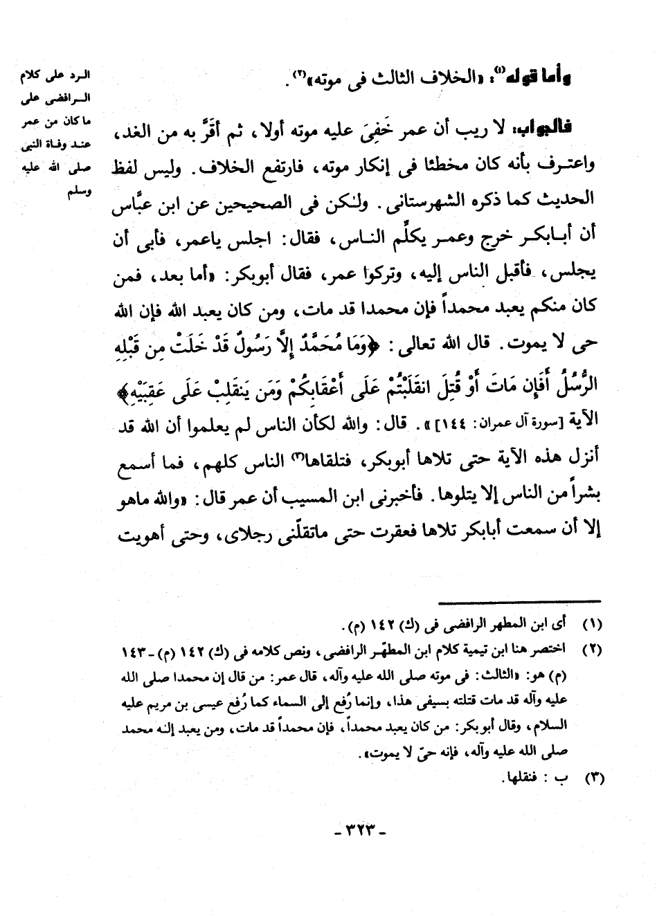 (¬2) اخْتَصَرَ هُنَا ابْنُ تَيْمِيَةَ كَلَامَ ابْنِ الْمُطَهَّرِ الرَّافِضِيِّ، وَنَصُّ كَلَامِهِ فِي 142 م 143 (م) ، هُوَ: الثَّالِثُ فِي مَوْتِهِ - صَلَّى اللَّهُ عَلَيْهِ وَآلِهِ -، قَالَ عُمَرُ: مَنْ قَالَ إِنَّ مُحَمَّدًا - صَلَّى اللَّهُ عَلَيْهِ وَآلِهِ - قَدْ مَاتَ قَتَلْتُهُ بِسَيْفِي هَذَا، وَإِنَّمَا رُفِعَ إِلَى السَّمَاءِ كَمَا رُفِعَ عِيسَى بْنُ مَرْيَمَ - عَلَيْهِ السَّلَامُ -. وَقَالَ أَبُو بَكْرٍ: مَنْ كَانَ يَعْبُدُ مُحَمَّدًا، فَإِنَّ مُحَمَّدًا قَدْ مَاتَ، وَمَنْ يَعْبُدُ إِلَهَ مُحَمَّدٍ - صَلَّى اللَّهُ عَلَيْهِ وَآلِهِ -، فَإِنَّهُ حَيٌّ لَا يَمُوتُ.