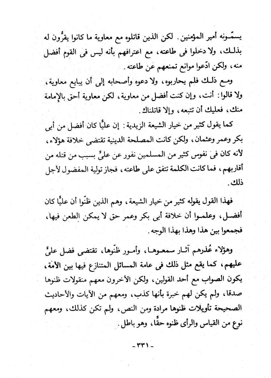 وَهَؤُلَاءِ عُذْرُهُمْ آثَارٌ سَمِعُوهَا، وَأُمُورٌ ظَنُّوهَا، تَقْتَضِي فَضْلَ عَلِيٍّ عَلَيْهِمْ، كَمَا يَقَعُ مِثْلَ ذَلِكَ فِي عَامَّةِ الْمَسَائِلِ الْمُتَنَازَعِ فِيهَا بَيْنَ الْأُمَّةِ، يَكُونُ الصَّوَابُ مَعَ أَحَدِ الْقَوْلَيْنِ، وَلَكِنِ الْآخَرُونَ مَعَهُمْ مَنْقُولَاتٍ ظَنُّوهَا صِدْقًا، وَلَمْ يَكُنْ لَهُمْ خِبْرَةٌ بِأَنَّهَا كَذِبٌ، وَمَعَهُمْ مِنَ الْآيَاتِ وَالْأَحَادِيثِ الصَّحِيحَةِ تَأْوِيلَاتٌ ظَنُّوهَا مُرَادَةً وَمِنَ النَّصِّ، وَلَمْ تَكُنْ كَذَلِكَ، وَمَعَهُمْ نَوْعٌ مِنَ الْقِيَاسِ وَالرَّأْيِ ظَنُّوهُ حَقًّا، وَهُوَ بَاطِلٌ.