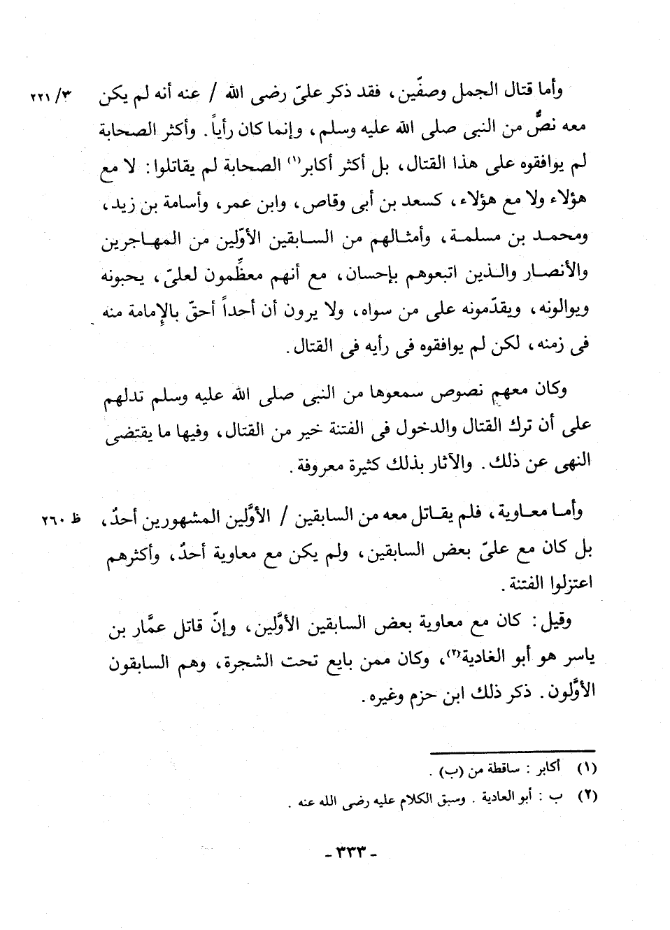 وَأَمَّا مُعَاوِيَةُ، فَلَمْ يُقَاتِلْ مَعَهُ مِنَ السَّابِقِينَ الْأَوَّلِينَ الْمَشْهُورِينَ أَحَدٌ، بَلْ كَانَ مَعَ عَلِيٍّ بَعْضُ السَّابِقِينَ وَلَمْ يَكُنْ مَعَ مُعَاوِيَةَ أَحَدٌ، وَأَكْثَرُهُمُ اعْتَزَلُوا الْفِتْنَةَ.
