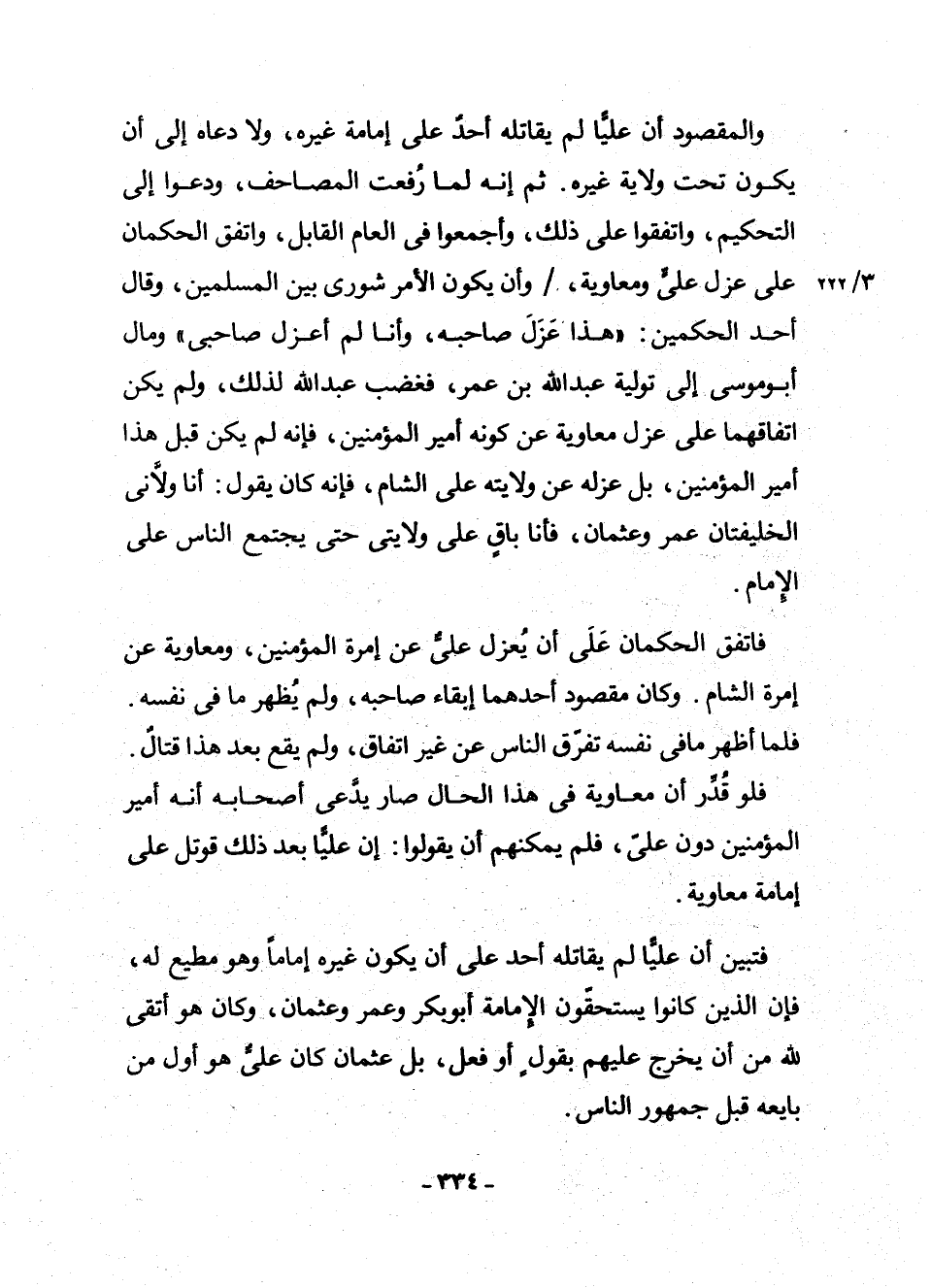 فَتَبَيَّنَ أَنَّ عَلِيًّا لَمْ يُقَاتِلْهُ أَحَدٌ عَلَى أَنْ يَكُونَ غَيْرُهُ إِمَامًا وَهُوَ مُطِيعٌ لَهُ، فَإِنَّ الَّذِينَ كَانُوا يَسْتَحِقُّونَ الْإِمَامَةَ أَبُو بَكْرٍ وَعُمَرُ وَعُثْمَانُ، وَكَانَ هُوَ أَتْقَى لِلَّهِ مِنْ أَنْ يَخْرُجَ عَلَيْهِمْ بِقَوْلٍ أَوْ فِعْلٍ، بَلْ عُثْمَانُ كَانَ عَلِيٌّ هُوَ أَوَّلُ مَنْ بَايَعَهُ قَبْلَ جُمْهُورِ النَّاسِ.