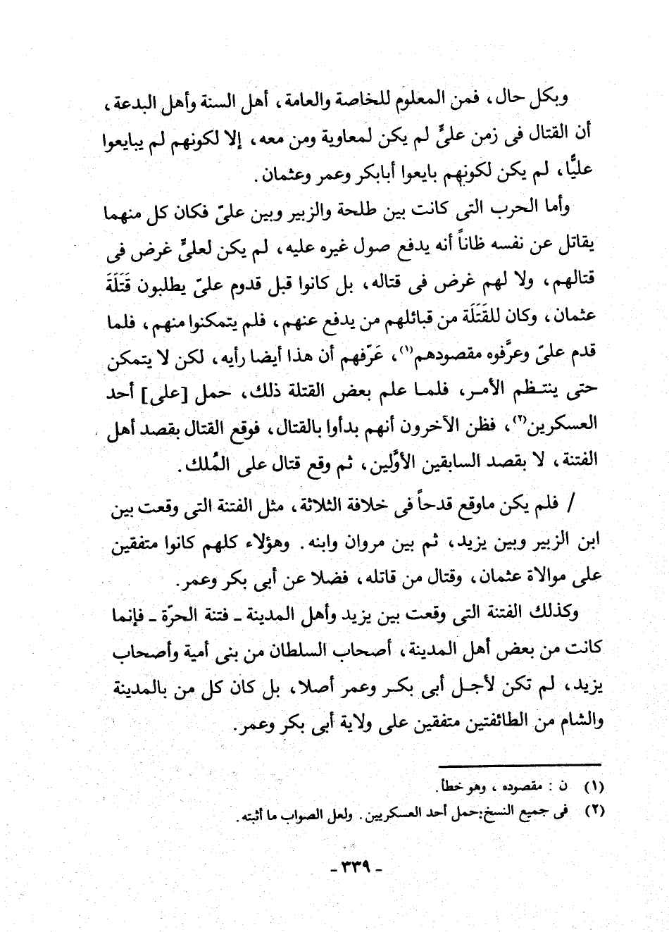 وَأَمَّا الْحَرْبُ الَّتِي كَانَتْ بَيْنَ طَلْحَةَ وَالزُّبَيْرِ وَبَيْنَ عَلِيٍّ فَكَانَ كُلٌّ مِنْهُمَا يُقَاتِلُ عَنْ نَفْسِهِ ظَانًّا أَنَّهُ يَدْفَعُ صَوْلَ غَيْرِهِ عَلَيْهِ، لَمْ يَكُنْ لِعَلِيٍّ غَرَضٌ فِي قِتَالِهِمْ، وَلَا لَهُمْ غَرَضٌ فِي قِتَالِهِ، بَلْ كَانُوا قَبْلَ قُدُومِ عَلِيٍّ يَطْلُبُونَ قَتَلَةَ عُثْمَانَ، وَكَانَ لِلْقَتَلَةِ مِنْ قَبَائِلِهِمْ مَنْ يَدْفَعُ عَنْهُمْ، فَلَمْ يَتَمَكَّنُوا مِنْهُمْ، فَلَمَّا قَدِمَ عَلِيٌّ وَعَرَّفُوهُ مَقْصُودَهُمْ (¬1) ، عَرَّفَهُمْ أَنَّ هَذَا أَيْضًا رَأْيُهُ، لَكِنْ لَا يَتَمَكَّنُ حَتَّى يَنْتَظِمَ الْأَمْرُ، فَلَمَّا عَلِمَ بَعْضُ الْقَتَلَةِ ذَلِكَ، حَمَلَ [عَلَى] أَحَدِ الْعَسْكَرَيْنِ (¬2) ، فَظَنَّ الْآخَرُونَ أَنَّهُمْ بَدَأُوا بِالْقِتَالِ، فَوَقَعَ الْقِتَالُ بِقَصْدِ أَهْلِ الْفِتْنَةِ لَا بِقَصْدِ السَّابِقِينَ الْأَوَّلِينَ، ثُمَّ وَقَعَ قِتَالٌ عَلَى الْمُلْكِ.
