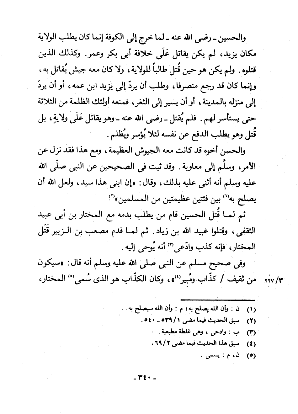 وَالْحُسَيْنُ - رَضِيَ اللَّهُ عَنْهُ - لَمَّا خَرَجَ إِلَى الْكُوفَةِ إِنَّمَا كَانَ يَطْلُبُ الْوِلَايَةَ مَكَانَ يَزِيدَ، لَمْ يَكُنْ يُقَاتِلُ عَلَى خِلَافَةِ أَبِي بَكْرٍ وَعُمَرَ. وَكَذَلِكَ الَّذِينَ قَتَلُوهُ. وَلَمْ يَكُنْ هُوَ حِينَ قُتِلَ طَالِبًا لِلْوِلَايَةِ، وَلَا كَانَ مَعَهُ جَيْشٌ يُقَاتِلُ بِهِ، وَإِنَّمَا كَانَ قَدْ رَجَعَ مُنْصَرِفًا وَطَلَبَ أَنْ يُرَدَّ إِلَى يَزِيدَ ابْنِ عَمِّهِ، أَوْ أَنْ يُرَدَّ إِلَى مَنْزِلِهِ بِالْمَدِينَةِ، أَوْ يَسِيرَ إِلَى الثَّغْرِ، فَمَنَعَهُ أُولَئِكَ الظَّلَمَةُ مِنَ الثَّلَاثَةِ حَتَّى يَسْتَأْسِرَ لَهُمْ، فَلَمْ يُقْتَلْ - رَضِيَ اللَّهُ عَنْهُ - وَهُوَ يُقَاتِلُ عَلَى وِلَايَةٍ، بَلْ قُتِلَ وَهُوَ يَطْلُبُ الدَّفْعَ عَنْ نَفْسِهِ لِئَلَّا يُؤْسَرَ وَيُظْلَمَ.