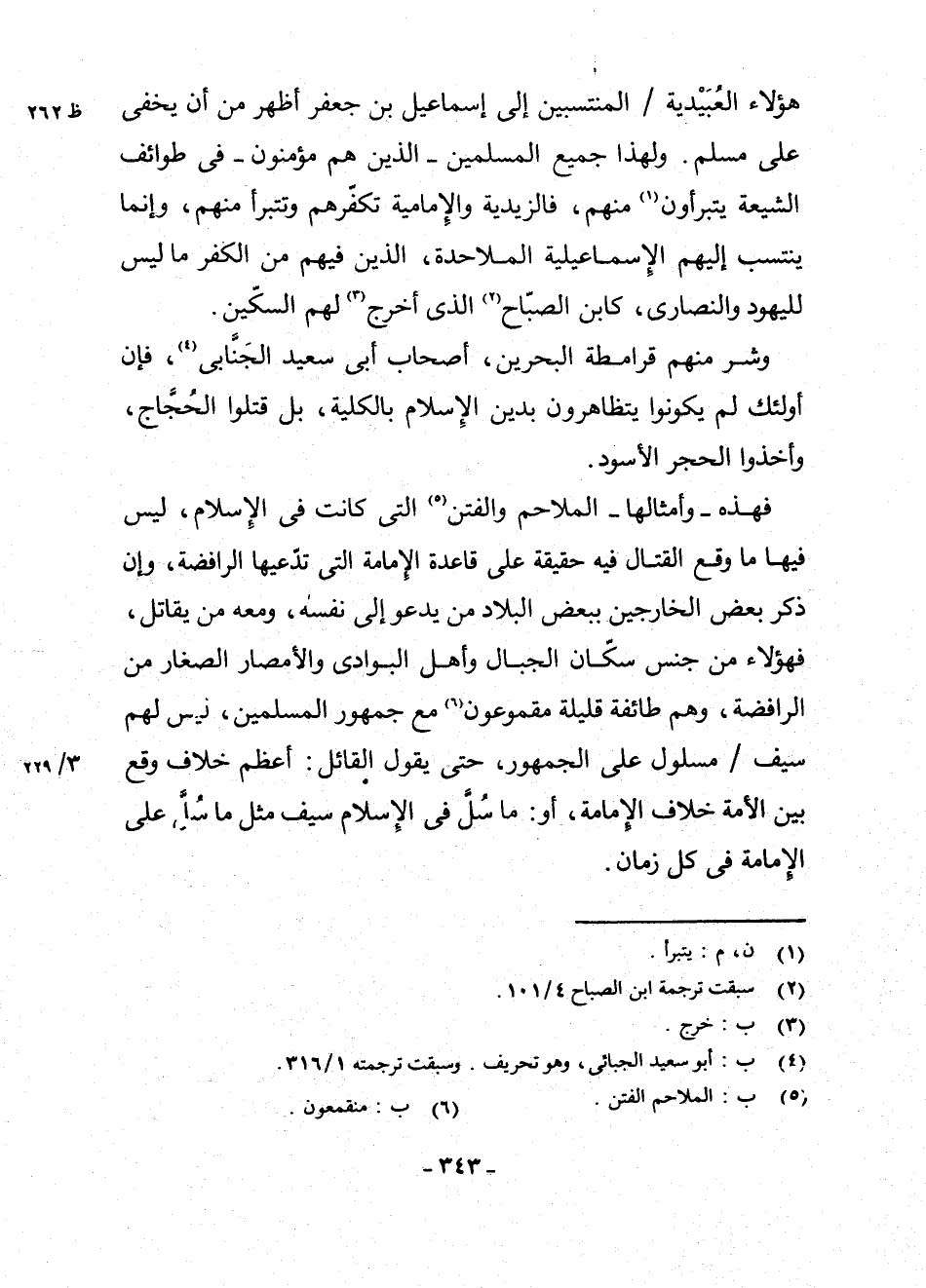 هَؤُلَاءِ الْعُبَيْدِيَّةِ الْمُنْتَسِبِينَ إِلَى إِسْمَاعِيلَ بْنِ جَعْفَرٍ أَظْهَرُ مِنْ أَنْ يَخْفَى عَلَى مُسْلِمٍ. وَلِهَذَا جَمِيعُ الْمُسْلِمِينَ - الَّذِينَ هُمْ مُؤْمِنُونَ - فِي طَوَائِفِ الشِّيعَةِ يَتَبَرَّأُونَ (¬1) مِنْهُمْ، فَالزَّيْدِيَّةُ وَالْإِمَامِيَّةُ تُكَفِّرُهُمْ وَتَتَبَرَّأُ مِنْهُمْ، وَإِنَّمَا يَنْتَسِبُ إِلَيْهِمُ الْإِسْمَاعِيلِيَّةُ الْمَلَاحِدَةُ، الَّذِينَ فِيهِمْ مِنَ الْكُفْرِ مَا لَيْسَ لِلْيَهُودِ وَالنَّصَارَى، كَابْنِ الصَّبَّاحِ (¬2) الَّذِي أَخْرَجَ (¬3) لَهُمُ السِّكِّينَ.