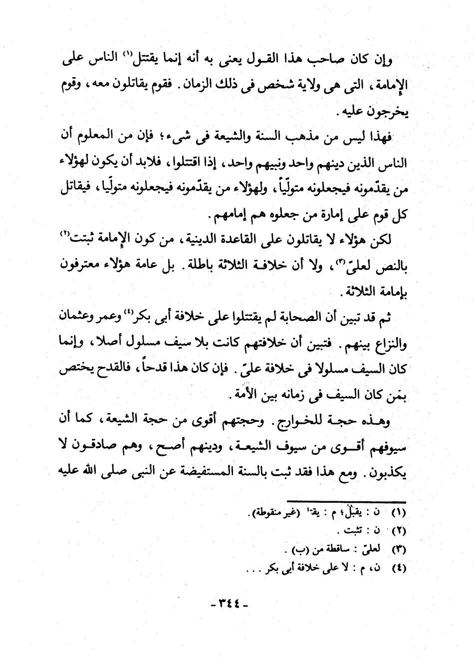 فَهَذَا لَيْسَ مِنْ مَذْهَبِ السُّنَّةِ وَالشِّيعَةِ فِي شَيْءٍ ; فَإِنَّ مِنَ الْمَعْلُومِ أَنَّ النَّاسَ الَّذِينَ دِينُهُمْ وَاحِدٌ وَنَبِيُّهُمْ وَاحِدٌ، إِذَا اقْتَتَلُوا، فَلَا بُدَّ أَنْ يَكُونَ لِهَؤُلَاءِ مَنْ يُقَدِّمُونَهُ فَيَجْعَلُونَهُ مُتَوَلِّيًا، وَلِهَؤُلَاءِ مَنْ يُقَدِّمُونَهُ فَيَجْعَلُونَهُ مُتَوَلِّيًا، فَيُقَاتِلُ كُلُّ قَوْمٍ عَلَى إِمَارَةِ مَنْ جَعَلُوهُ هُمْ إِمَامَهُمْ.