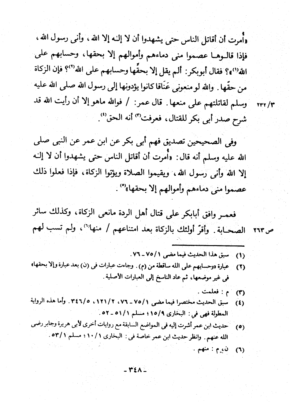 وَفِي الصَّحِيحَيْنِ تَصْدِيقُ فَهْمِ أَبِي بَكْرٍ عَنِ ابْنِ عُمَرَ عَنِ النَّبِيِّ - صَلَّى اللَّهُ عَلَيْهِ وَسَلَّمَ - أَنَّهُ قَالَ: " «أُمِرْتُ أَنْ أُقَاتِلَ النَّاسَ حَتَّى يَشْهَدُوا أَنْ لَا إِلَهَ إِلَّا اللَّهُ وَأَنِّي رَسُولُ اللَّهِ، وَيُقِيمُوا الصَّلَاةَ وَيُؤْتُوا الزَّكَاةَ، فَإِذَا فَعَلُوا ذَلِكَ عَصَمُوا مِنِّي دِمَاءَهُمْ وَأَمْوَالَهُمْ إِلَّا بِحَقِّهَا» " (¬5) .