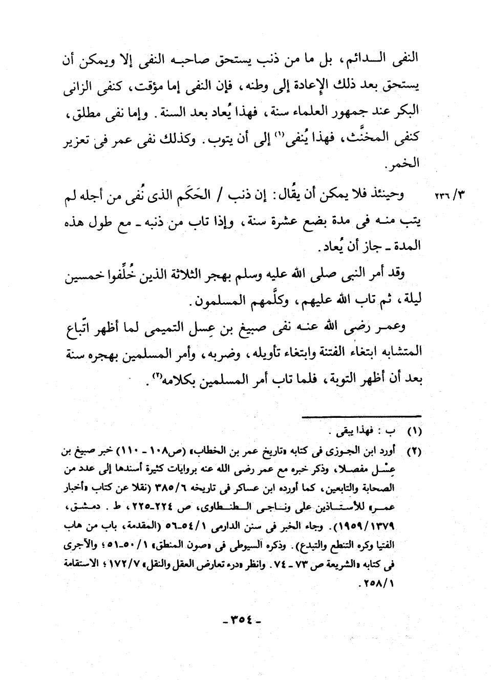 وَعُمَرُ - رَضِيَ اللَّهُ عَنْهُ - نَفَى صُبَيْغَ بْنَ عَسَلٍ التَّمِيمِيَّ لَمَّا أَظْهَرَ اتِّبَاعَ الْمُتَشَابِهِ ابْتِغَاءَ الْفِتْنَةِ وَابْتِغَاءَ تَأْوِيلِهِ، وَضَرَبَهُ، وَأَمَرَ الْمُسْلِمِينَ بِهَجْرِهِ سَنَةً بَعْدَ أَنْ أَظْهَرَ التَّوْبَةَ، فَلَمَّا تَابَ أَمَرَ الْمُسْلِمِينَ بِكَلَامِهِ (¬2) .