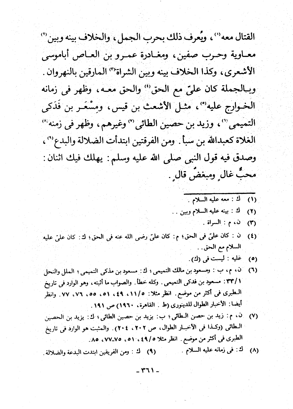 الْقِتَالِ مَعَهُ (¬1) ، وَيُعْرَفُ ذَلِكَ بِحَرْبِ الْجَمَلِ، وَالْخِلَافُ بَيْنَهُ وَبَيْنَ (¬2) مُعَاوِيَةَ، وَحَرْبُ صِفِّينَ، وَمُغَادَرَةُ عَمْرِو بْنِ الْعَاصِ أَبَا مُوسَى الْأَشْعَرِيِّ، وَكَذَا الْخِلَافُ بَيْنَهُ وَبَيْنَ الشُّرَاةِ (¬3) الْمَارِقِينَ بِالنَّهْرَوَانِ. وَبِالْجُمْلَةِ كَانَ عَلِيٌّ مَعَ الْحَقِّ (¬4) وَالْحَقُّ مَعَهُ، وَظَهَرَ فِي زَمَانِهِ الْخَوَارِجُ عَلَيْهِ (¬5) ، مِثْلُ الْأَشْعَثِ بْنِ قَيْسٍ، وَمِسْعَرِ بْنِ فَدَكِيٍّ التَّمِيمِيِّ (¬6) ، وَزَيْدِ بْنِ حُصَيْنٍ الطَّائِيِّ (¬7) وَغَيْرِهِمْ، وَظَهَرَ فِي زَمَنِهِ (¬8) الْغُلَاةُ كَعَبْدِ اللَّهِ بْنِ سَبَأٍ. وَمِنَ الْفِرْقَتَيْنِ ابْتَدَأَتِ الضَّلَالَةُ وَالْبِدَعُ (¬9) ، وَصَدَقَ فِيهِ قَوْلُ النَّبِيَّ - صَلَّى اللَّهُ عَلَيْهِ وَسَلَّمَ - «يَهْلَكُ فِيكَ اثْنَانِ: مُحِبٌّ غَالٍ وَمُبْغِضٌ قَالٍ» .