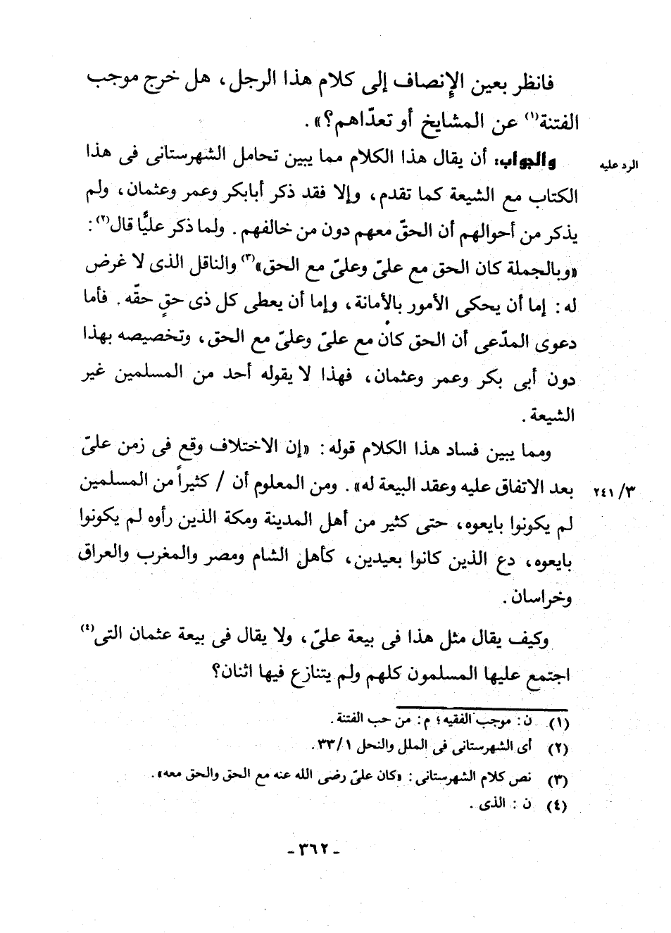 (¬3) نَصُّ كَلَامِ الشَّهْرَسْتَانِيِّ كَانَ عَلِيٌّ - رَضِيَ اللَّهُ عَنْهُ - مَعَ الْحَقِّ وَالْحَقُّ مَعَهُ.