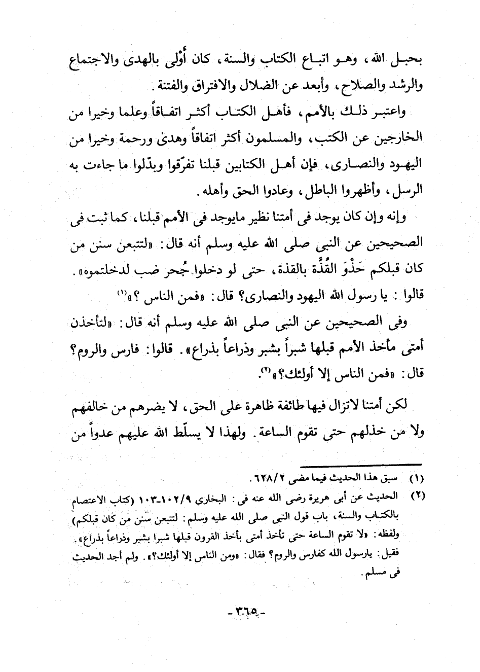 (¬2) الْحَدِيثُ عَنْ أَبِي هُرَيْرَةَ - رَضِيَ اللَّهُ عَنْهُ - فِي الْبُخَارِيِّ 9/102 - 103 (كِتَابِ الِاعْتِصَامِ بِالْكِتَابِ وَالسُّنَّةِ، بَابِ قَوْلِ النَّبِيِّ - صَلَّى اللَّهُ عَلَيْهِ وَسَلَّمَ -: لَتَتَّبِعُنَّ سَنَنَ مَنْ كَانَ قَبْلَكُمْ، وَلَفْظُهُ: " لَا تَقُومُ السَّاعَةُ حَتَّى تَأْخُذَ أُمَّتِي بِأَخْذِ الْقُرُونِ قَبْلَهَا شِبْرًا بِشِبْرٍ وَذِرَاعًا بِذِرَاعٍ) فَقِيلَ: يَا رَسُولَ اللَّهِ، كَفَارِسَ وَالرُّومِ؟ فَقَالَ: وَمَنِ النَّاسُ إِلَّا أُولَئِكَ؟ وَلَمْ أَجِدِ الْحَدِيثَ فِي مُسْلِمٍ.