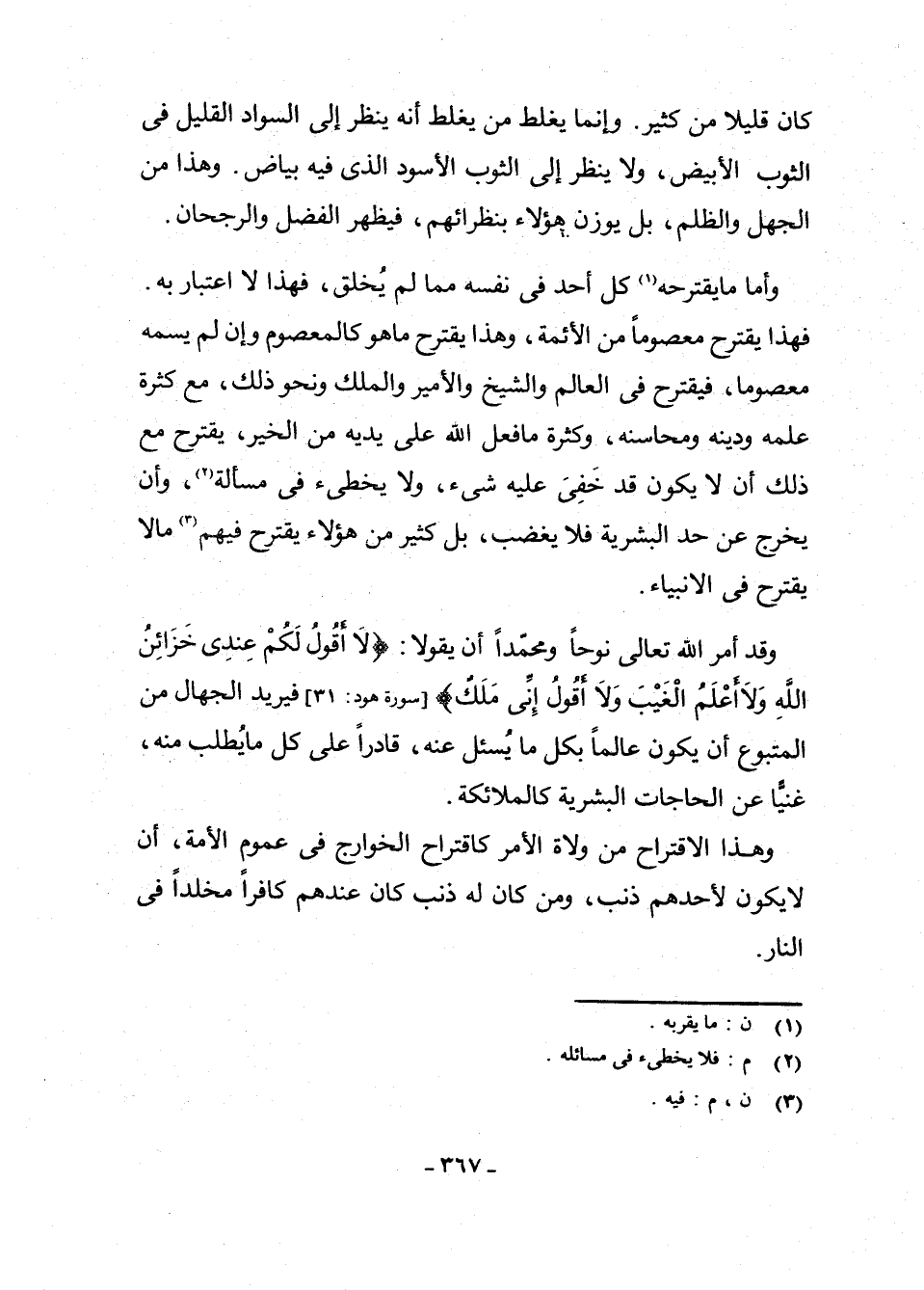 وَأَمَّا مَا يَقْتَرِحُهُ (¬1) كُلُّ أَحَدٍ فِي نَفْسِهِ مِمَّا لَمْ يُخْلَقْ، فَهَذَا لَا اعْتِبَارَ بِهِ. فَهَذَا يَقْتَرِحُ مَعْصُومًا فِي الْأَئِمَّةِ، وَهَذَا يَقْتَرِحُ مَا هُوَ كَالْمَعْصُومِ وَإِنْ لَمْ يُسَمِّهِ مَعْصُومًا، فَيَقْتَرِحُ فِي الْعَالِمِ وَالشَّيْخِ وَالْأَمِيرِ وَالْمَلِكِ وَنَحْوِ ذَلِكَ، مَعَ كَثْرَةِ عِلْمِهِ وَدِينِهِ وَمَحَاسِنِهِ، وَكَثْرَةِ مَا فَعَلَ اللَّهُ عَلَى يَدَيْهِ مِنَ الْخَيْرِ، يَقْتَرِحُ مَعَ ذَلِكَ أَنْ لَا يَكُونَ قَدْ خَفِيَ عَلَيْهِ شَيْءٌ، وَلَا يُخْطِئُ فِي مَسْأَلَةٍ (¬2) ، وَأَنْ يَخْرُجَ عَنْ حَدِّ الْبَشَرِيَّةِ فَلَا يَغْضَبُ، بَلْ كَثِيرٌ مِنْ هَؤُلَاءِ يُقْتَرَحُ فِيهِمْ (¬3) مَا لَا يُقْتَرَحُ فِي الْأَنْبِيَاءِ.