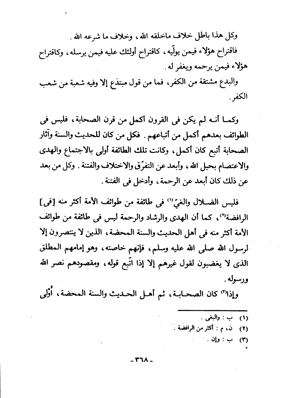 فَلَيْسَ الضَّلَالُ وَالْغَيُّ (¬1) فِي طَائِفَةٍ مِنْ طَوَائِفِ الْأُمَّةِ أَكْثَرَ مِنْهُ [فِي] الرَّافِضَةِ (¬2) ، كَمَا أَنَّ الْهُدَى وَالرَّشَادَ وَالرَّحْمَةَ لَيْسَ فِي طَائِفَةٍ مِنْ طَوَائِفِ الْأُمَّةِ أَكْثَرَ مِنْهُ فِي أَهْلِ الْحَدِيثِ وَالسُّنَّةِ الْمَحْضَةِ، الَّذِينَ لَا يَنْتَصِرُونَ إِلَّا لِرَسُولِ اللَّهِ - صَلَّى اللَّهُ عَلَيْهِ وَسَلَّمَ -، فَإِنَّهُمْ خَاصَّتُهُ، وَهُوَ إِمَامُهُمُ الْمُطْلَقُ الَّذِي لَا يَغْضَبُونَ لِقَوْلِ غَيْرِهِمْ إِلَّا إِذَا اتَّبَعَ قَوْلَهُ، وَمَقْصُودُهُمْ نَصْرُ اللَّهِ وَرَسُولِهِ.