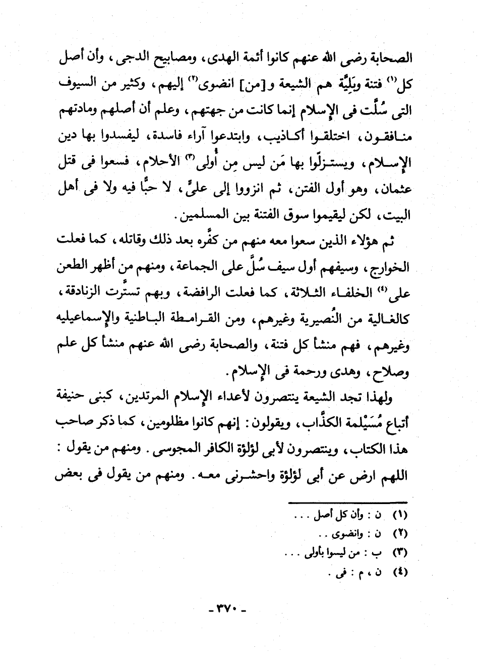 الصَّحَابَةَ رَضِيَ اللَّهُ عَنْهُمْ كَانُوا أَئِمَّةَ الْهُدَى، وَمَصَابِيحَ الدُّجَى، وَأَنَّ أَصْلَ كُلِّ (¬1) فِتْنَةٍ وَبَلِيَّةٍ هُمُ الشِّيعَةُ وَ [مَنِ] انْضَوَى (¬2) إِلَيْهِمْ، وَكَثِيرٌ مِنَ السُّيُوفِ الَّتِي سُلَّتْ فِي الْإِسْلَامِ إِنَّمَا كَانَتْ مِنْ جِهَتِهِمْ، وَعُلِمَ أَنَّ أَصْلَهُمْ وَمَادَّتَهُمْ مُنَافِقُونَ، اخْتَلَقُوا أَكَاذِيبَ، وَابْتَدَعُوا آرَاءً فَاسِدَةً، لِيُفْسِدُوا بِهَا دِينَ الْإِسْلَامِ، وَيَسْتَزِلُّوا بِهَا مَنْ لَيْسَ مَنْ أُولِي (¬3) الْأَحْلَامِ، فَسَعَوْا فِي قَتْلِ عُثْمَانَ، وَهُوَ أَوَّلُ الْفِتَنِ ثُمَّ انْزَوَوْا إِلَى عَلِيٍّ، لَا حُبًّا فِيهِ وَلَا فِي أَهْلِ الْبَيْتِ، لَكِنْ لِيُقِيمُوا سُوقَ الْفِتْنَةِ بَيْنَ الْمُسْلِمِينَ.